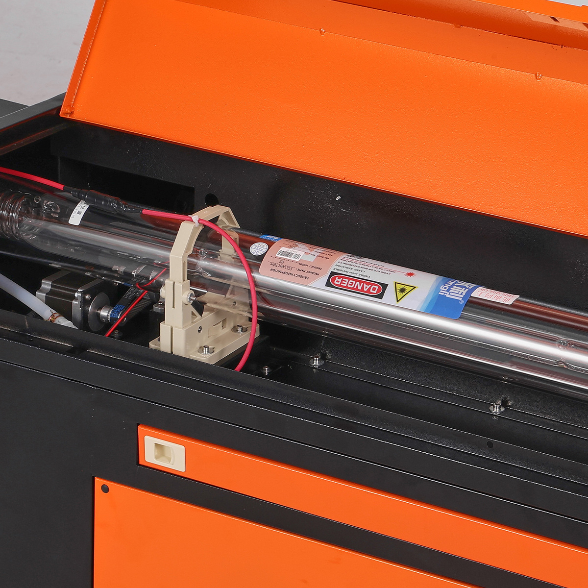 Secure Easy Operation: Work with peace of mind! The transparent window is tinted for eye protection, allowing you to monitor engraving progress at any time. The power automatically cuts off when opened. An emergency stop is standing by should anything go sideways. Our CO? laser machine also has an air assist to blow away all smoke, dust, and sparks. Movable wheels keep everything rolling smoothly.