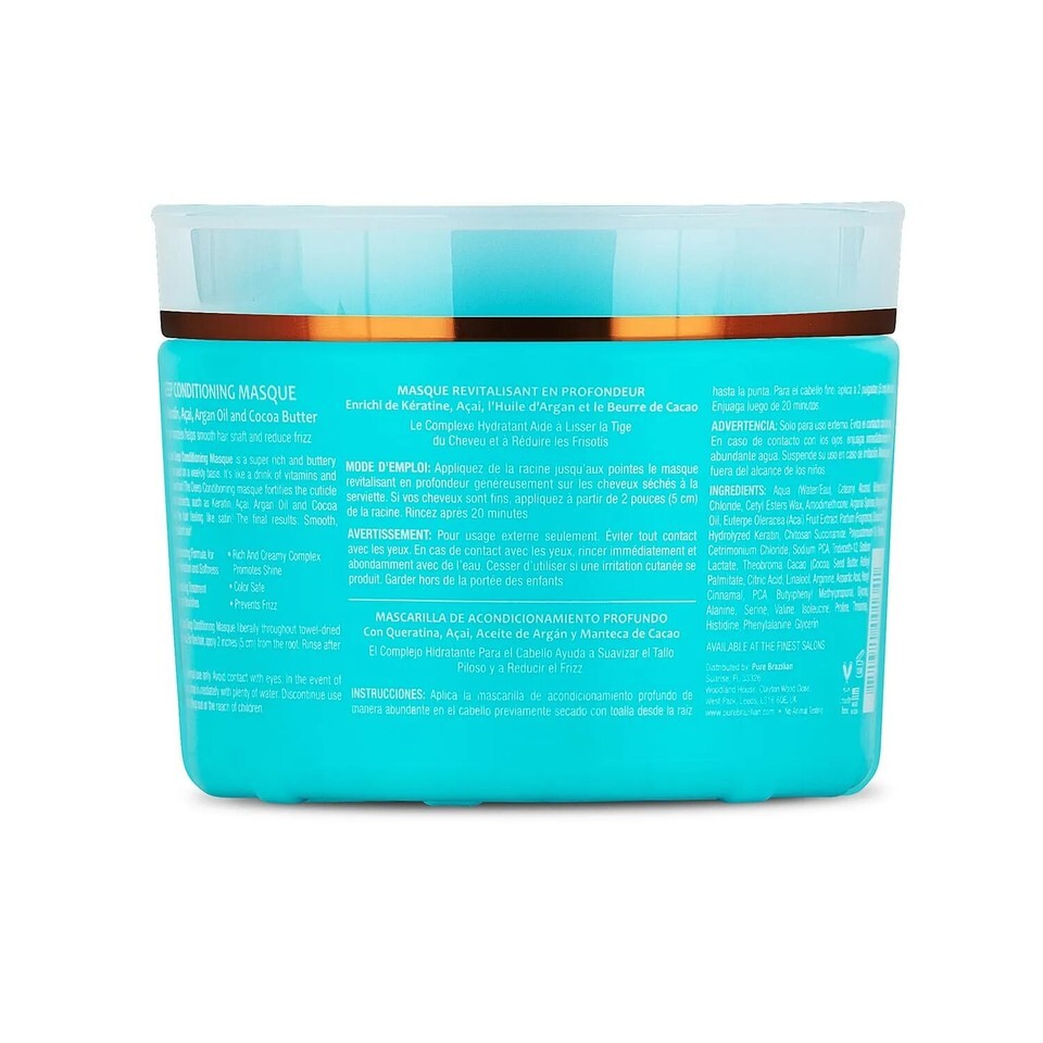 With Brazilian Keratin, Acai and Panthenol this Pure Brazilian ( Deep Conditioning Masque ) got hydrating hair complex smooths hair shaft and reduces frizz. This contains rich and creamy complex. Promotes shine and is color safe. The Masque fortifies the cuticle using essential nutrients, such as Keratin and Cocoa Seed Butter, leaving hair feeling like satin!
