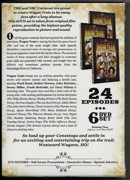 This is a Brand New, factory sealed DVD Set of the classic Western Series, WAGON TRAIN starring Ward Bond. The 6 DVD Set includes 24 classic episodes plus a Special Edition Bonus Disc.