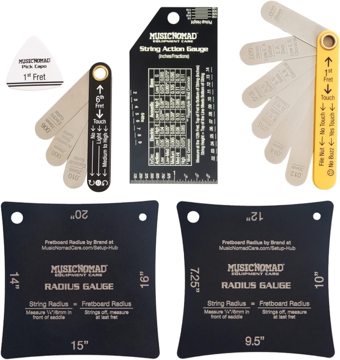String Action Gauge: Accurate Measurements that are Easy to Read with our Innovative Black Finish Contrasted with Deep Etched White Markings. Measurements in Inches, Metric Gauge Set: Accurate Measurements ?, ?, 10?, 12?, 14?, 15?, 16?, 20?