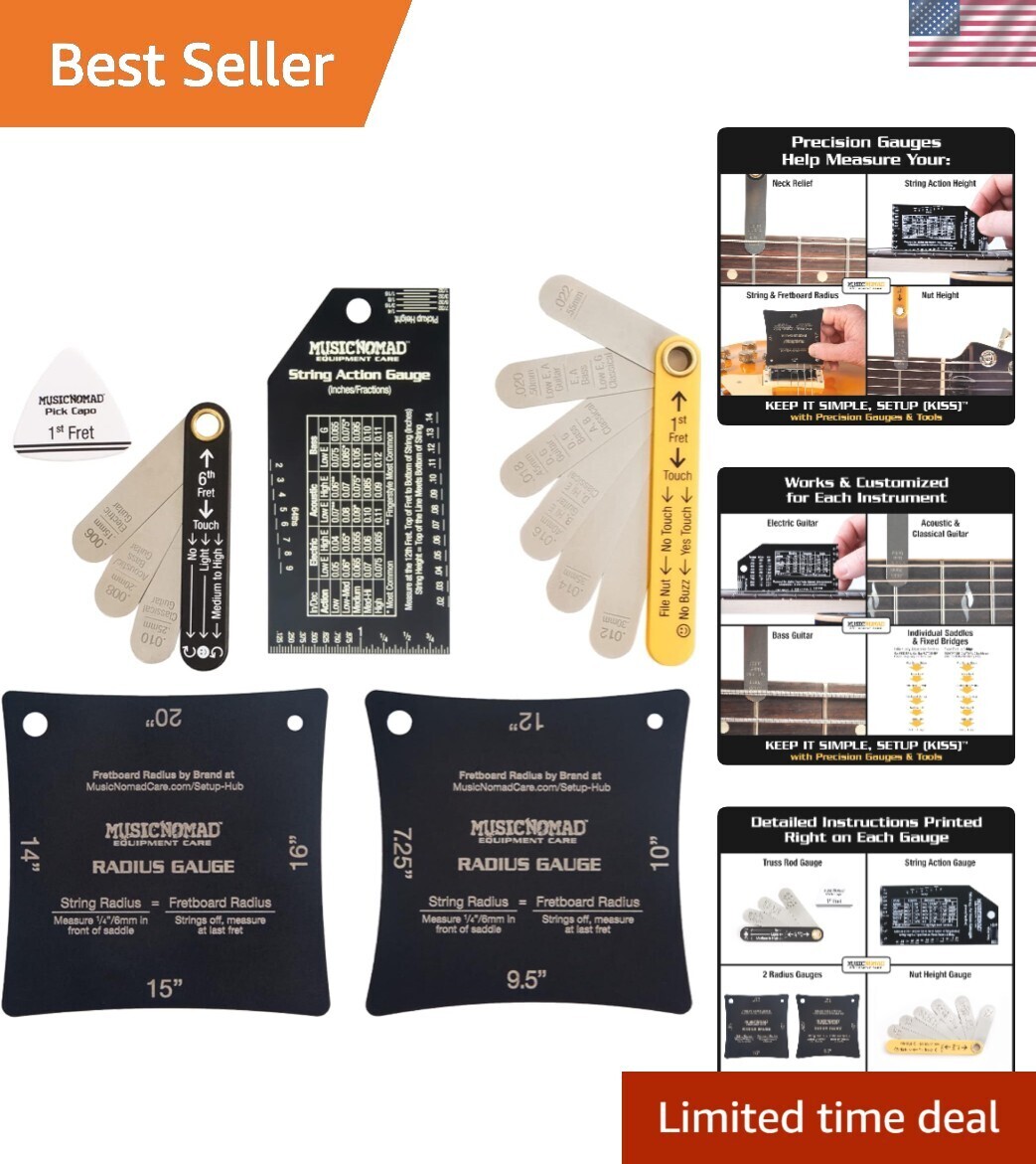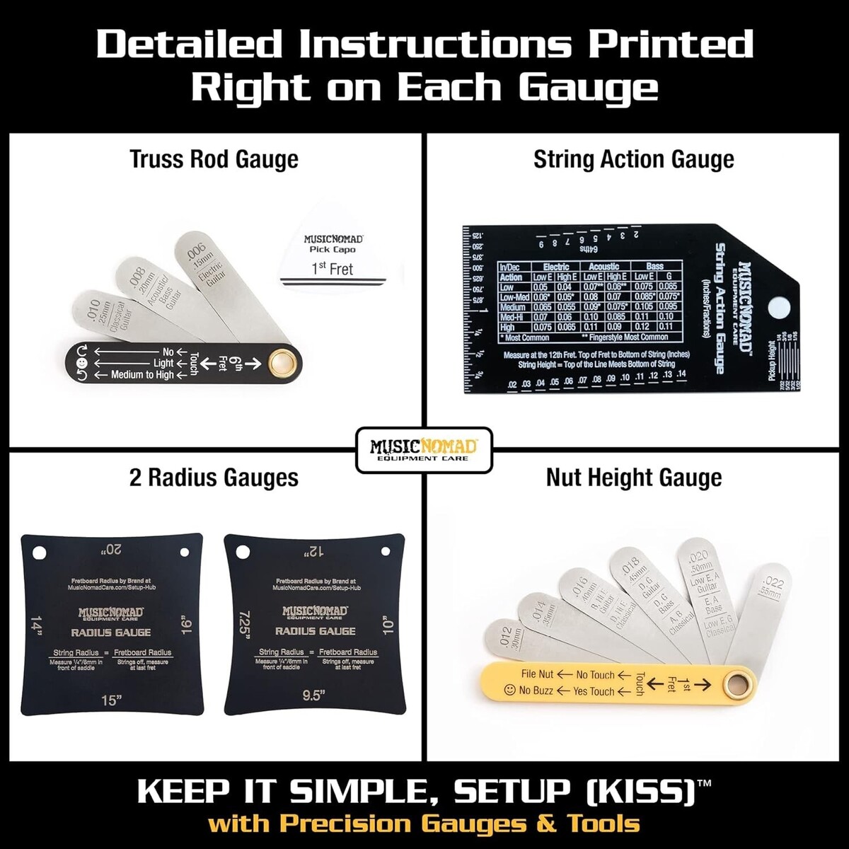 Not only is it fun, but a properly setup guitar takes your playing sound to a whole new level. ?s 6 pc. Precision Setup Gauge Set demystifies the setup process by developing innovative, high quality gauges combined with step-by-step general guidelines anybody can follow to help setup their guitar or bass. After several s of research development and in collaboration with Master Guitar Tech Geoff Luttrell other top repair techs, has developed the KEEP IT SIMPLE, SETUP (KISS). With our KISS method and our 6 pc. Setup Gauge Set you can check the vital areas of your instrument use our tools (sold separately) to perform your own setup. Whether you have an Electric, Acoustic, Classical, or Bass Guitar, we give you the exact spec you need by instrument type, including instructions printed right on the product taking the guesswork out of each task. The Set includes a: Truss Rod Gauge, Pick Capo, String Action Gauge, 2 Radius Gauges, Nut Height Gauge. We even include a 24 page instructional booklet a nice carrying case. That's quality ? raising the bar in equipment care.