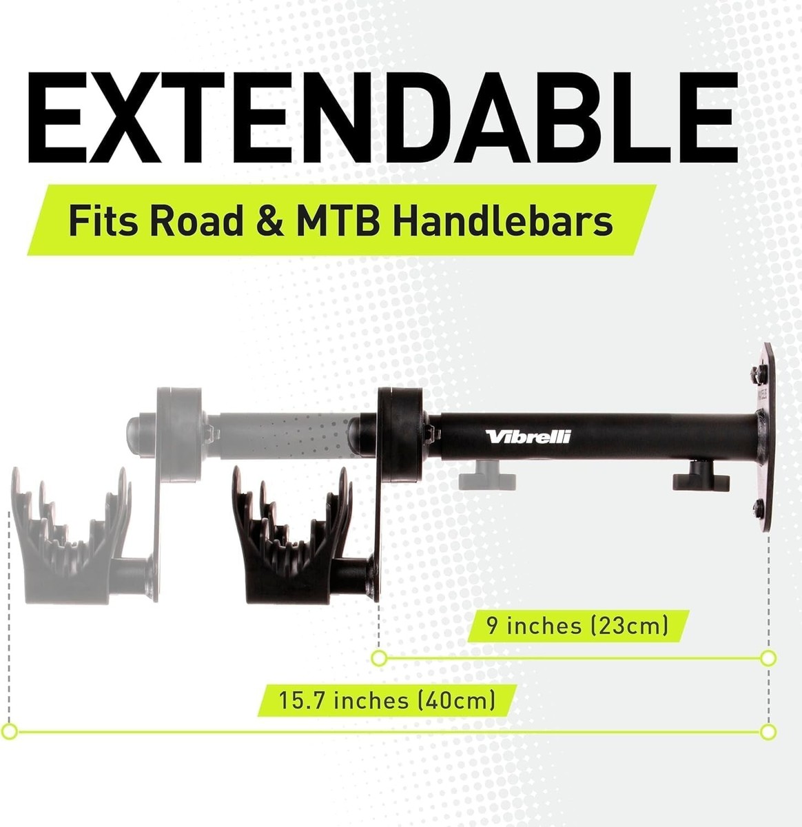 FULLY ADJUSTABLE - The bike wall mount slides out from the wall to fit narrow and wide handlebars up to inch - 800mm wide. Patented push button adjusts the rack arms to fit your bike frame. Flexible frame cradles hold the bike frame, won't crush cables or scratch paint. Includes wheel stabilizing strap to prevent the front wheel swinging