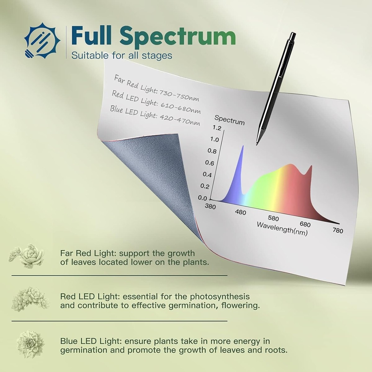 Sunlike Spectrum: Emulates natural light, ideal for all stages of plant development from seeding to growth and bloom. Add red spectrum to promote photosynthesis.