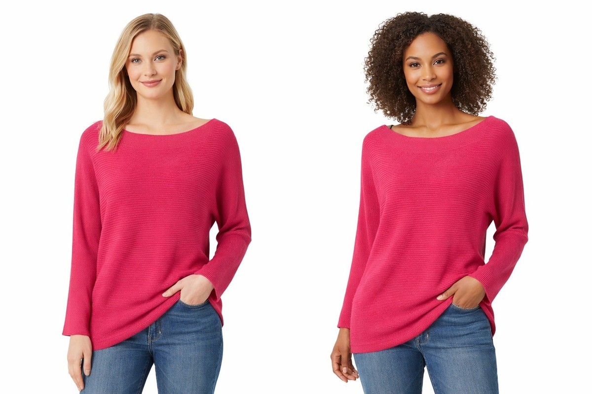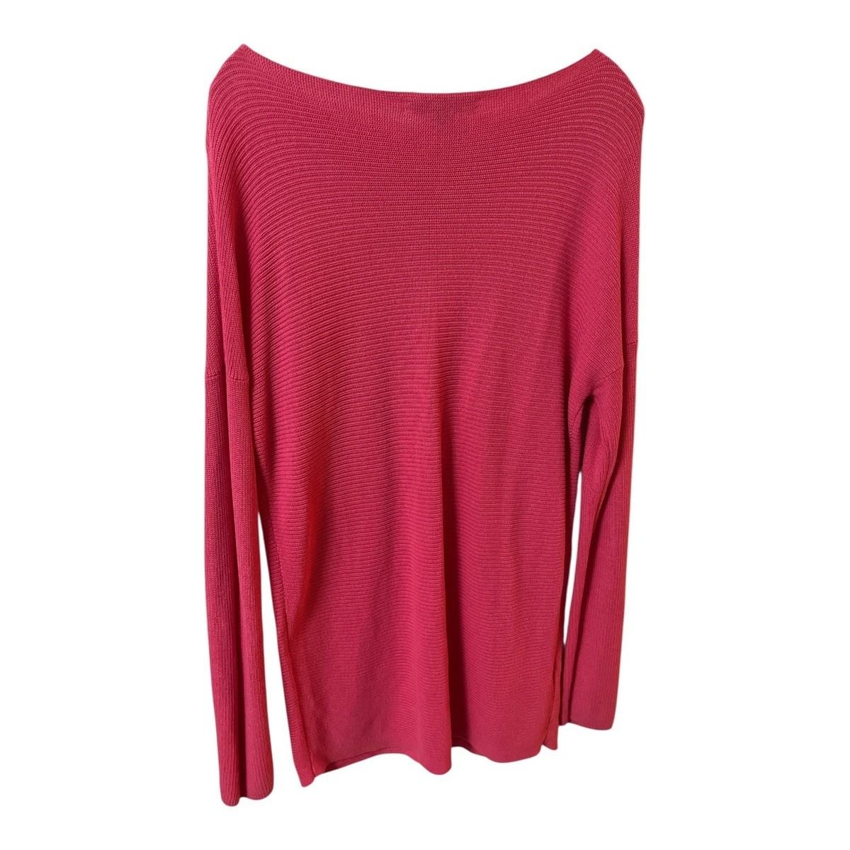 Early Y2K Tommy Bahama ribbed knit sweater in a vibrant pink shade. Features a wide boat neckline, relaxed drape, and long sleeves with a slightly oversized, fluid silhouette typical of early 2000s casual luxury styling. The cotton-viscose blend offers a soft, breathable feel with comfortable stretch and weight.