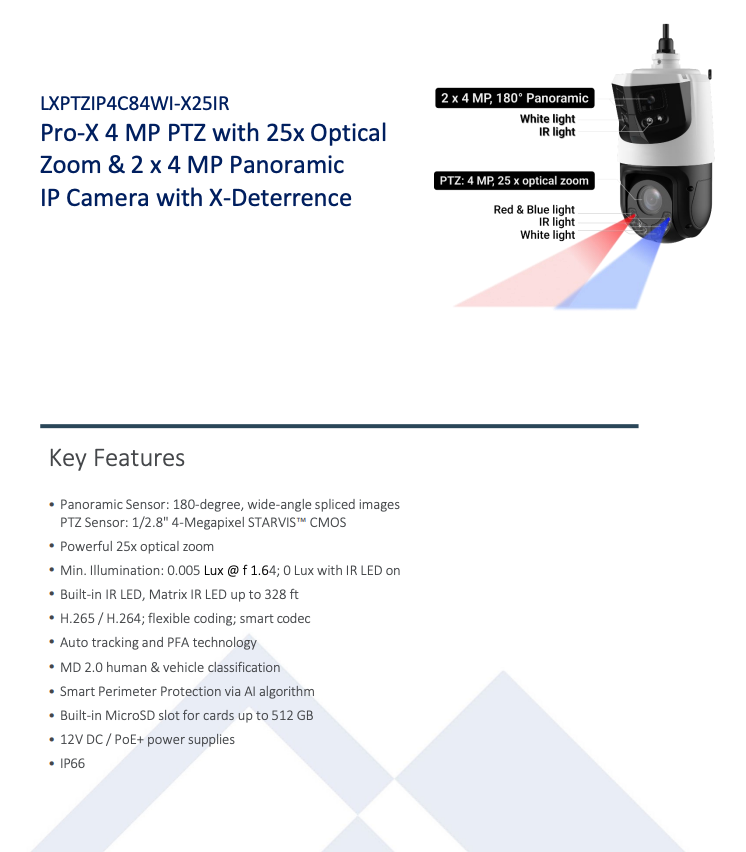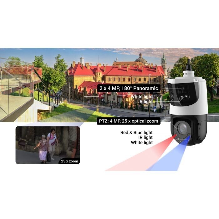 The Pro-X 4 MP PTZ with 25x Optical Zoom 2 x 4 MP Panoramic IP Camera Combination features amazing capabilities in both wide-angle imaging as well as detailed zoom. More than the sum of its parts, this mighty combo-camera creates a sturdy first-line of security defense optics anywhere it's installed.