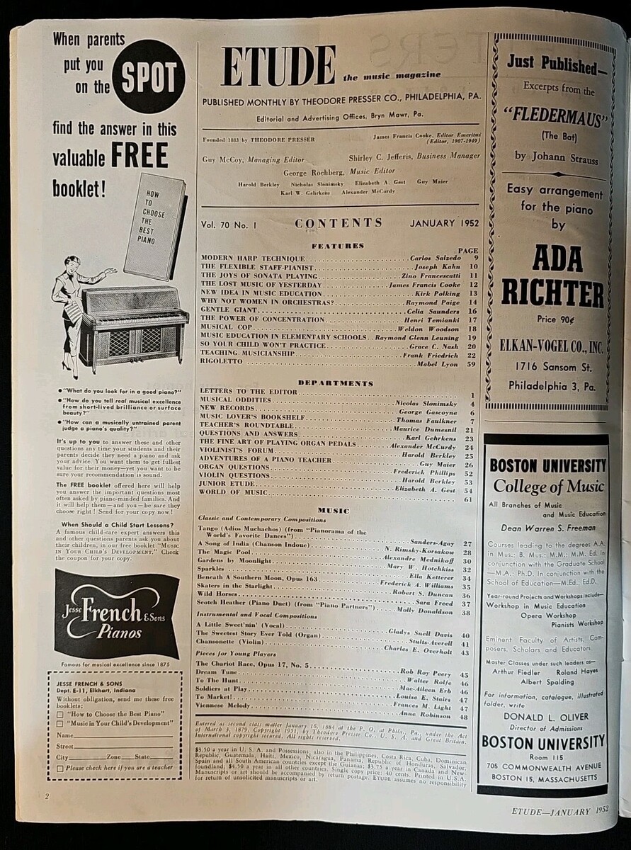Vintage issue of Etude: The Music Magazine, January 1952.