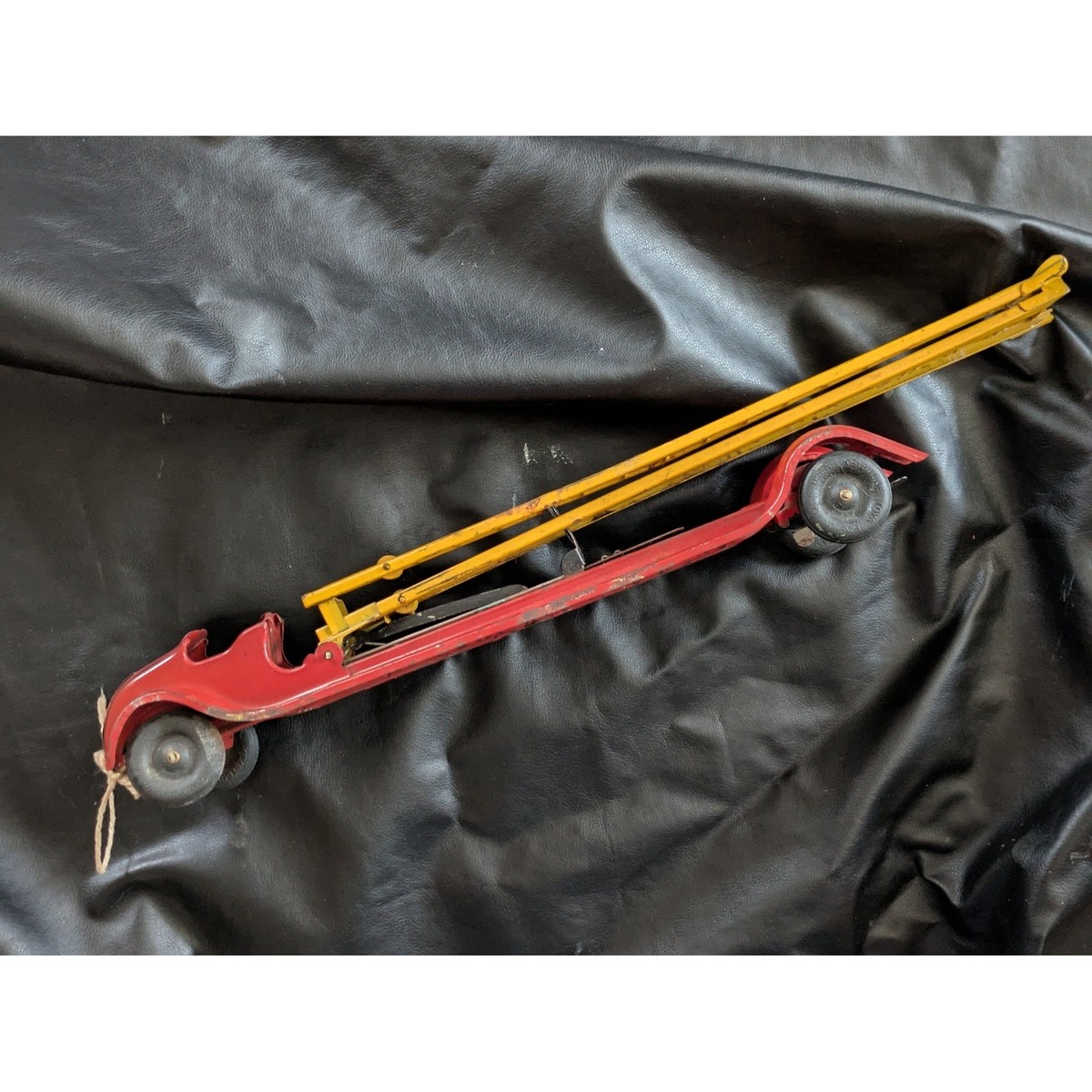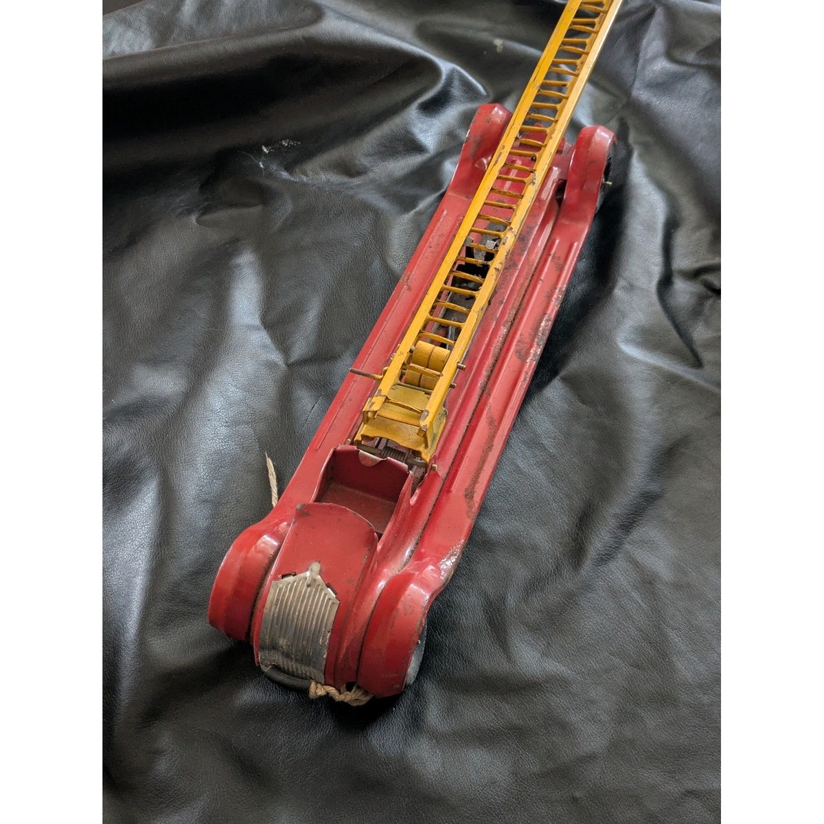 Parole chiave: giocattolo di latta, autopompa, giocattolo di metallo, giocattolo d'infanzia, nostalgia, pressofuso, giocattolo da collezione, veicolo da gioco, decorazione da scrivania, pezzo da esposizione, collezionista di giocattoli, vecchio giocattolo, giocattolo retro