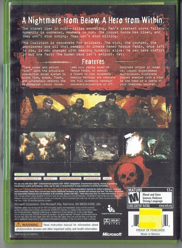 For Sale is a rare and hard to find xbox 360 Gears Of War video Game CIB! Its In good USED condition and has been Play Tested as can be seen from the pictures provided. Please ask Any and All Questions prior to purchasing. Fast Same or Next day shipping with Free Delivery Confirmation within the U.S. Payment Due within 7 days of purchase (if you need more time please let us know In advance) we love to combine shipping is always a Yes and Most of the time Additional Items Ship for free. SKU4MS