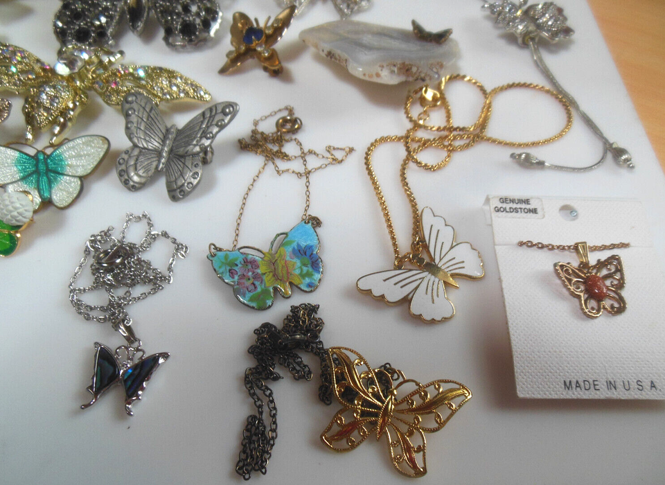 The lot includes a variety of butterfly brooches and necklaces, all with a unique mix of materials and colors. This is a great opportunity to add some color and vintage flair to your wardrobe.