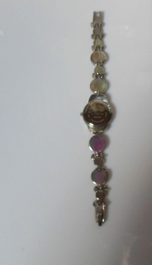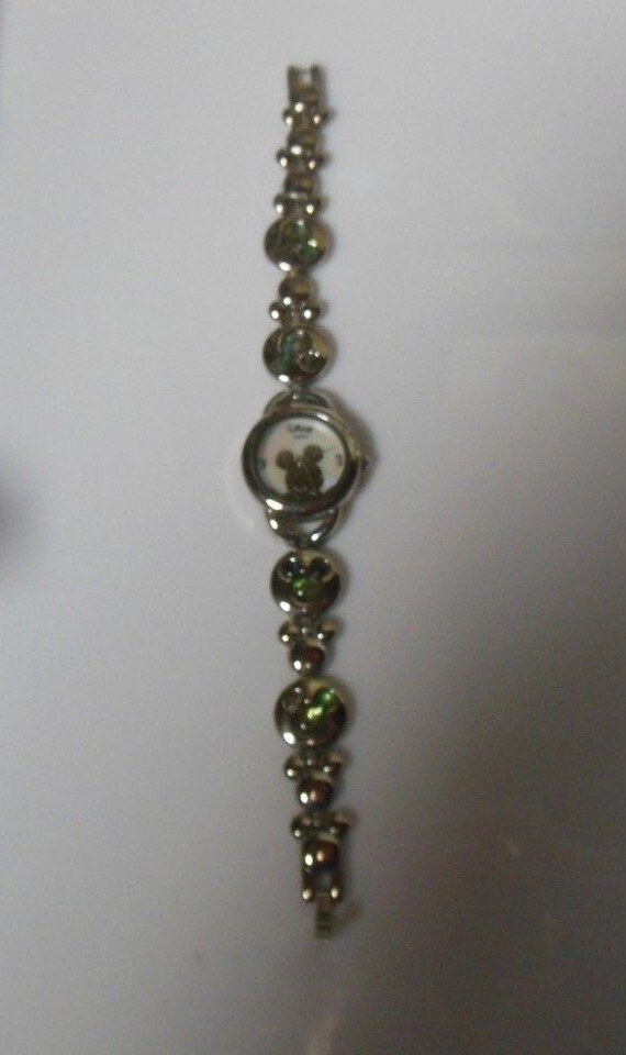 The silver band has inlaid shell Mickey mouse shape links