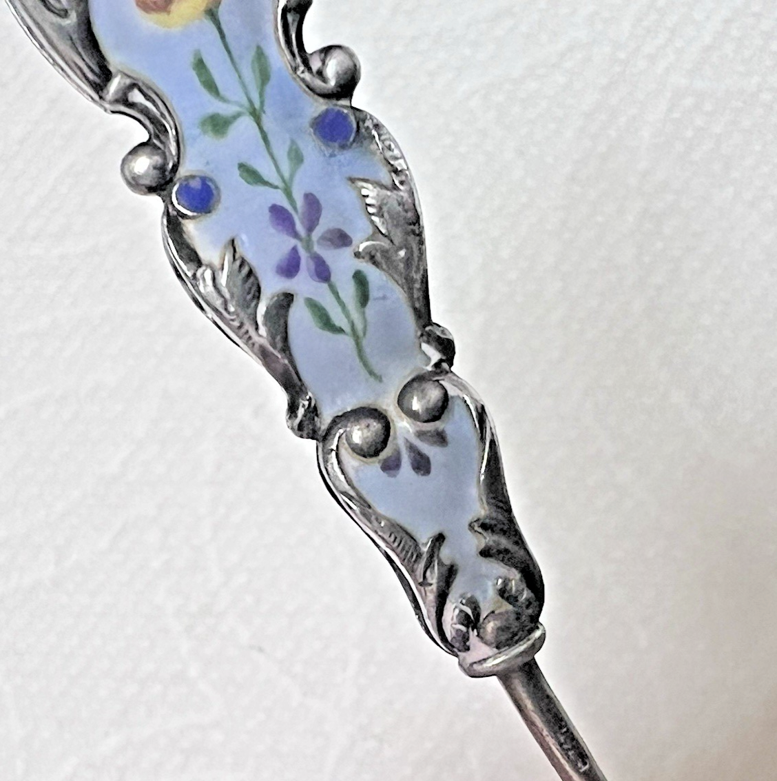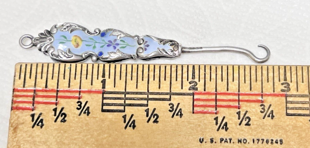 Antique Sterling Silver Button Hook Floral Enamel Chatelaine 2 7/8 inch In good shape however a small chip or worn spot on the enameling near the center bottom of the handle. The color is a soft sweet blue with a yellow and purple flower. The hook is so tiny it must be for gloves?