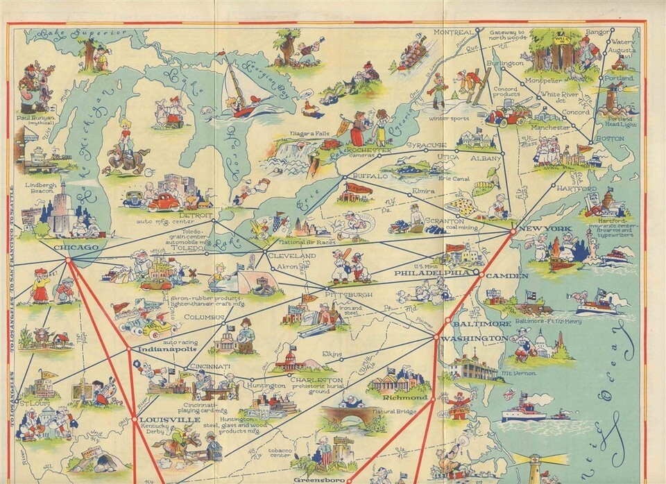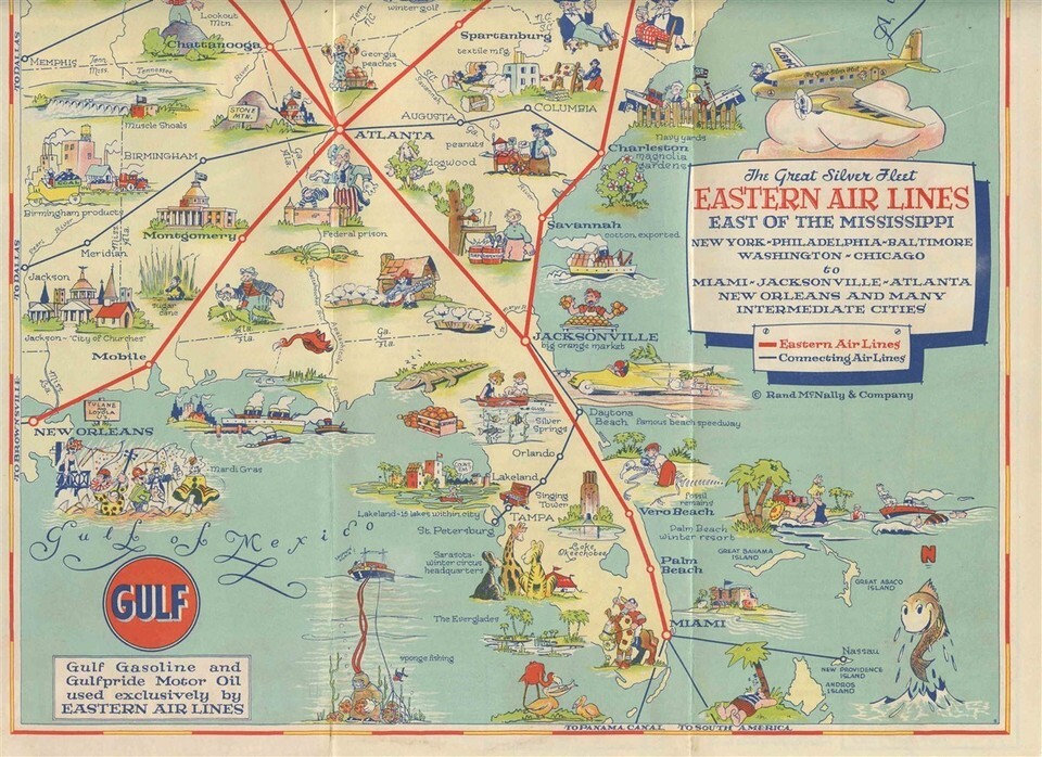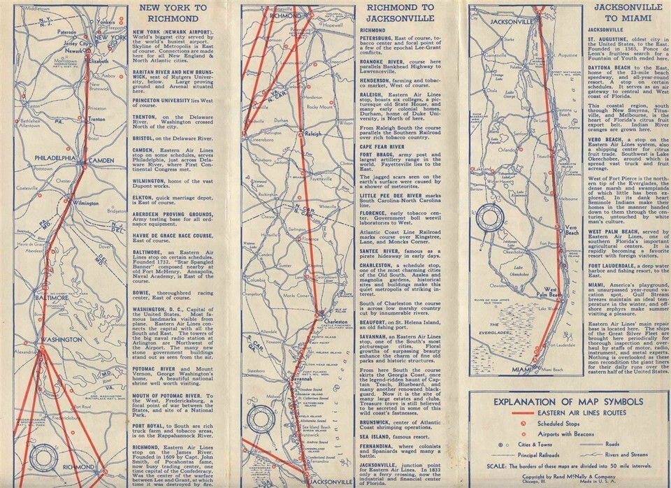 A 12 panel fold out with color pictorial route map of the Great Silver Fleet of Eastern Air Lines, East of the Mississippi on one side and 5 strip maps with information on each city on the route on the other side. From the 1940's when Eastern was part of North American Aviation