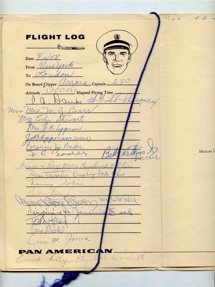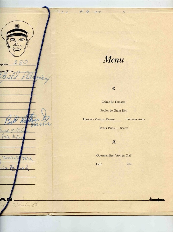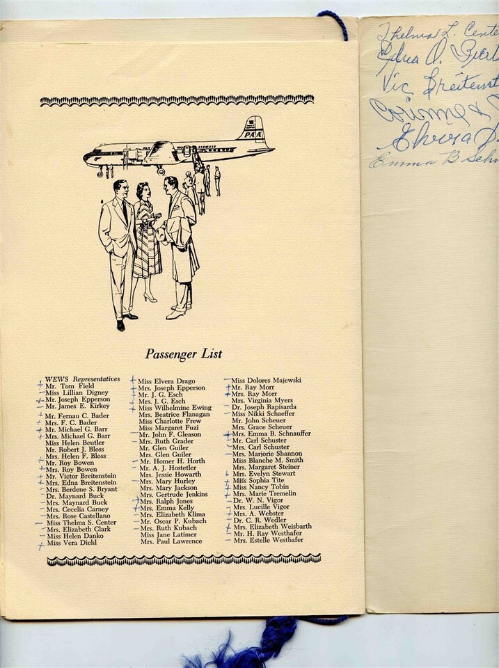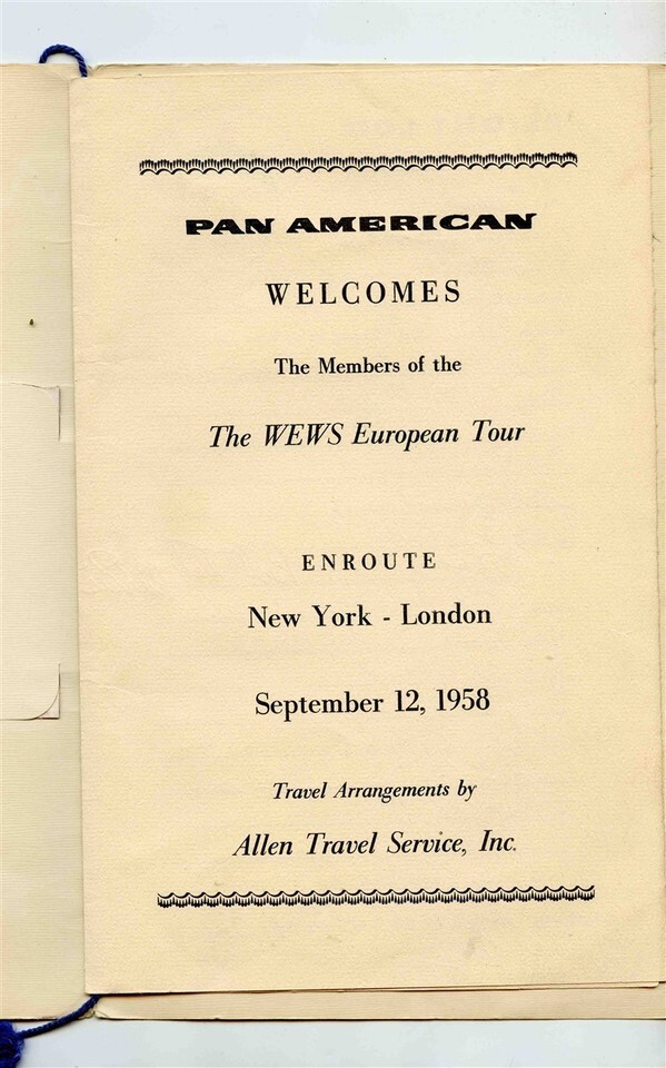An unusual Welcome Aboard Folder with Pan Am Postcard inserted in to the front cover, Has 4 interior pages held in to the folder with a blue cord. Pan American Welcomes The Members of the WEWS European Tour, enroute New York London on September 12, 1958. There is a page and a half of signatures. There is a Menu of the inflight meal and a page of the Passenger List with tic marks on it.
