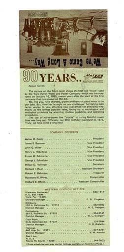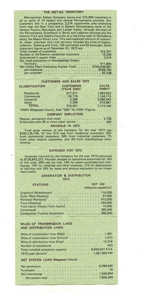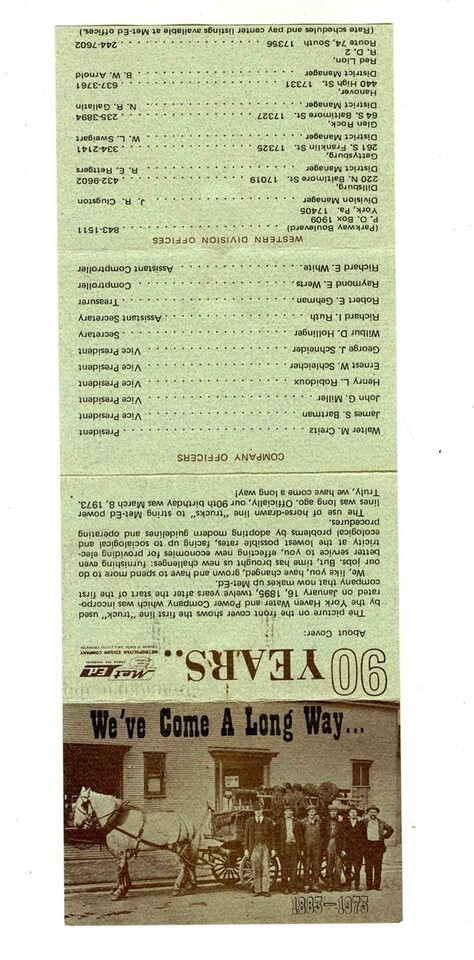 a 3 3/4" x 9 3/4" two sided card, Metropolitan Edison, Met Ed 90 Years History Card 1973 We've Come a Long Way . . With brief history, Company Officers, Western Division Offices, The Met Ed Territory, Sales and Expenses in 1972 and more.