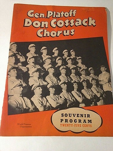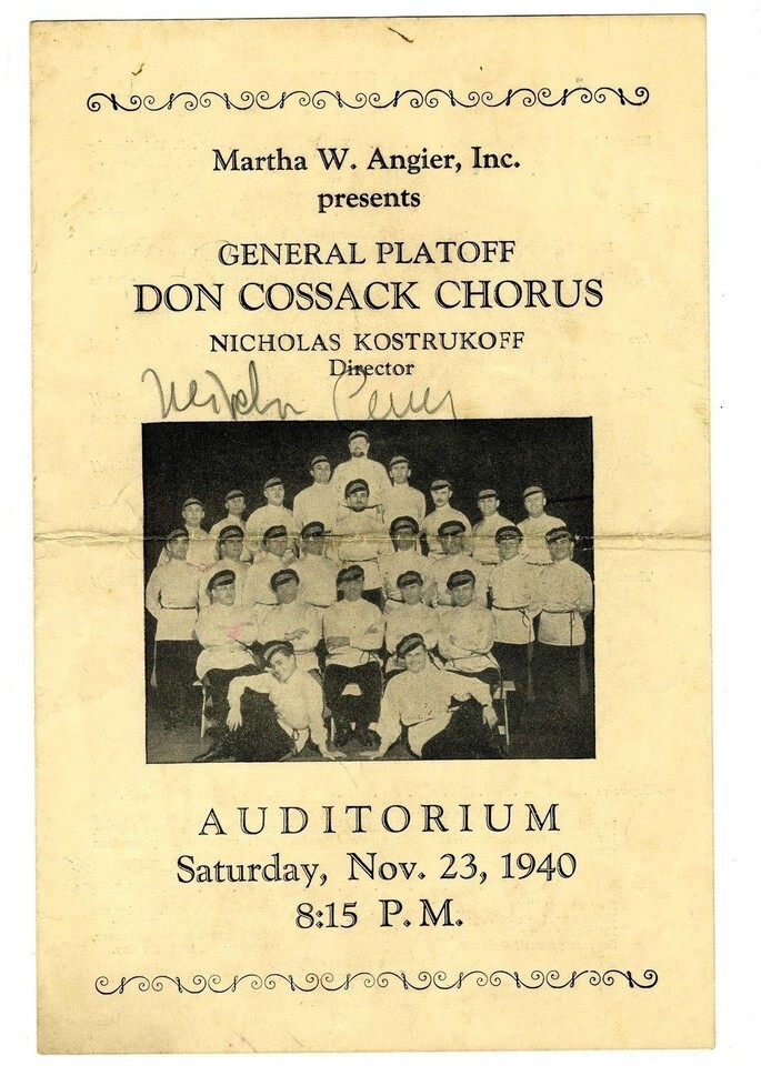 A Souvenir Program and performance program for General Platoff Don Cossack Chorus. From a 1941 performance at The Auditorium. In very good condition, Lots of photos, information and more. There is a signature on the front page of the performance program.