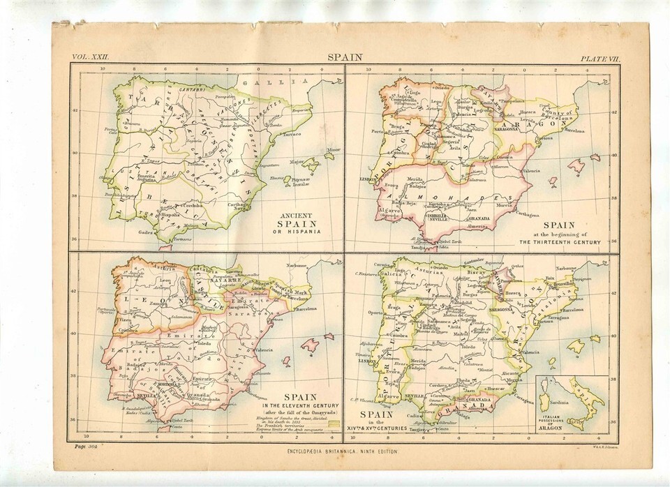 This single page map measures about 7 7/8" x 10 3/8" and the back is blank. It has 4 small maps of Spain including Ancisent Spain, Eleventh Century, Thirteenth Century and in the 14th and 25th Centuries, it is from Vol XXII Plate VII Plus a 2 page map is of Spain from the 19th Century with an inset map of former province. It measures about 10 3/8" x 14" XXII , Plate VI.