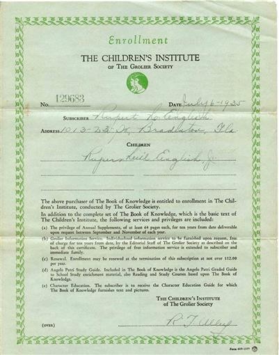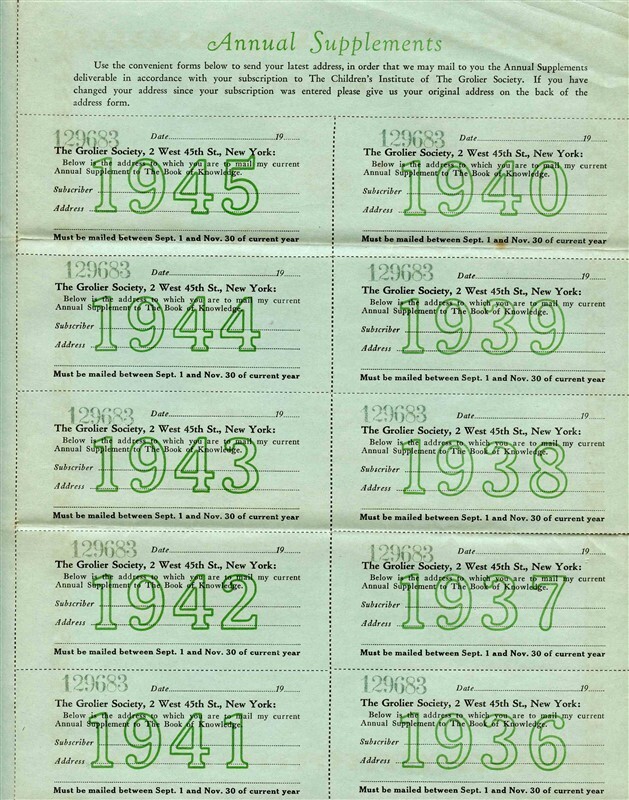 Has 4 pages that have been folded for mailing. The Children's Institute Enrollment Form from the The Book of Knowledge, dated 1935, Has a complete set of Supplement Coupons attached. These were to be used to get updated annual volumes. Measures about 8 1/2"x 11" when closed.