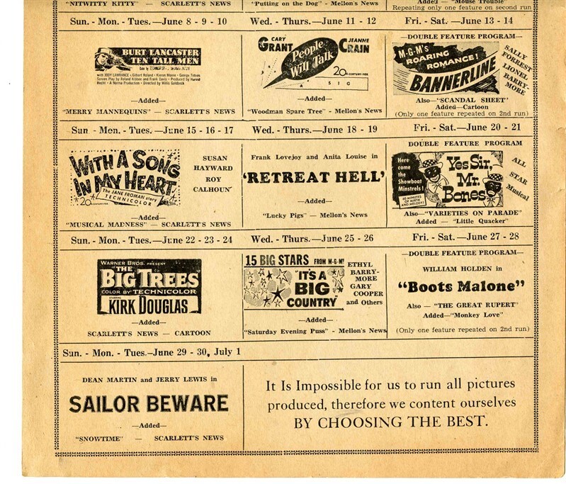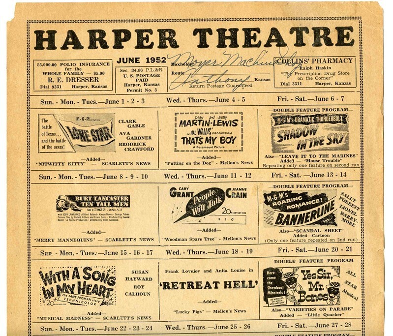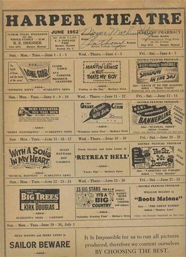 A 9 1/2" x 12 1/2" single sided poster on card stock of the movies being shown during the month of June 1952 at the Harper Theatre in Harper, Kansas. Appearing were Dean MArtin and Jerry Lewis, Clark Gable, Ava Gardner, William Holden, Gary Cooper, Susan Hayward, Burt Lancaster and many more. In very good condition with chipped corners and an edge tear.
