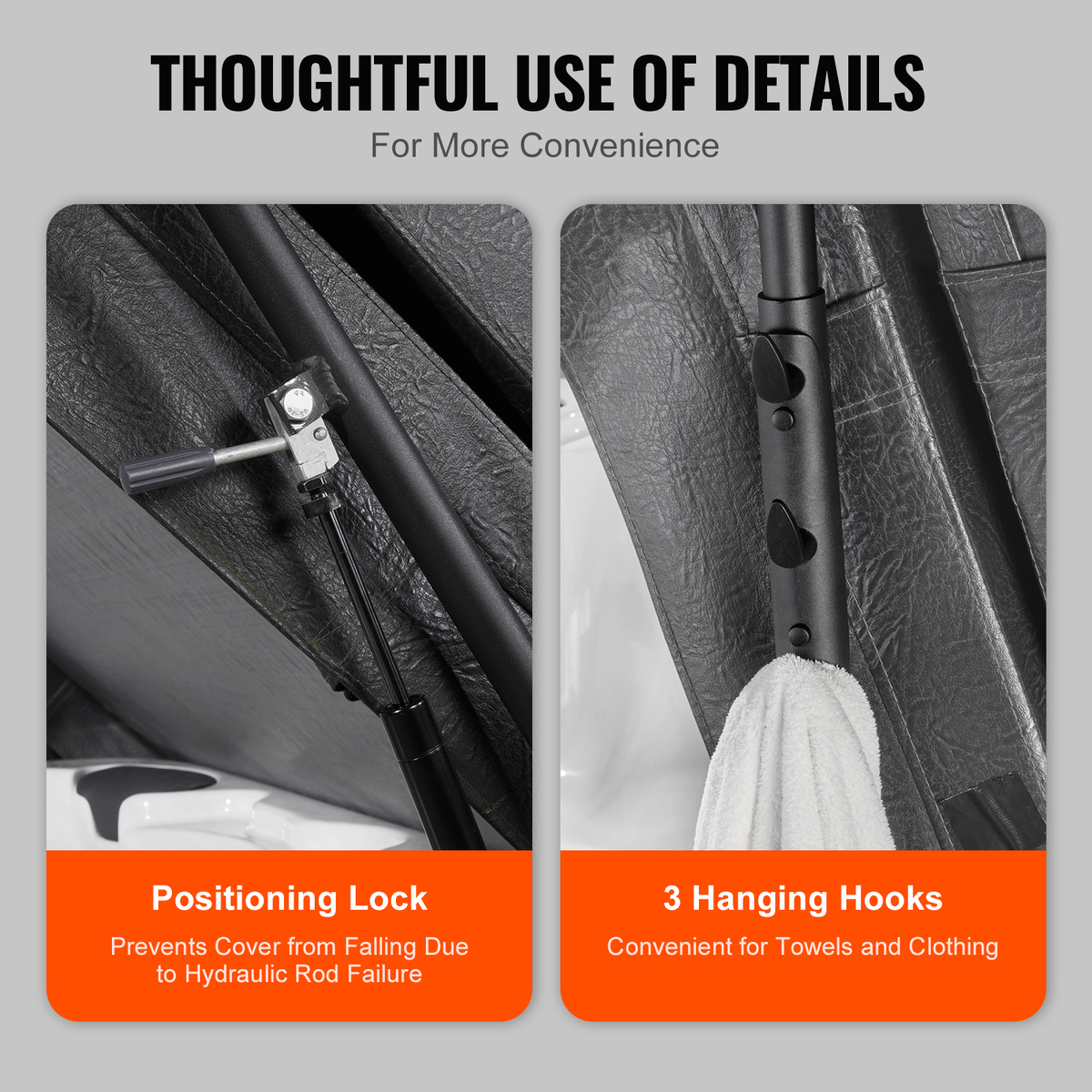 Convenient Detail Design: This hot tub cover lift is added with a self-locking position function to prevent the cover from falling down due to the failure of the hydraulic lever; three hooks are designed on the side of the bracket, which makes it easy to put towels and clothes when you are using it; we also made the bracket with an anti-sharp edge treatment, so that it won't be scratched no matter where you touch the lift.