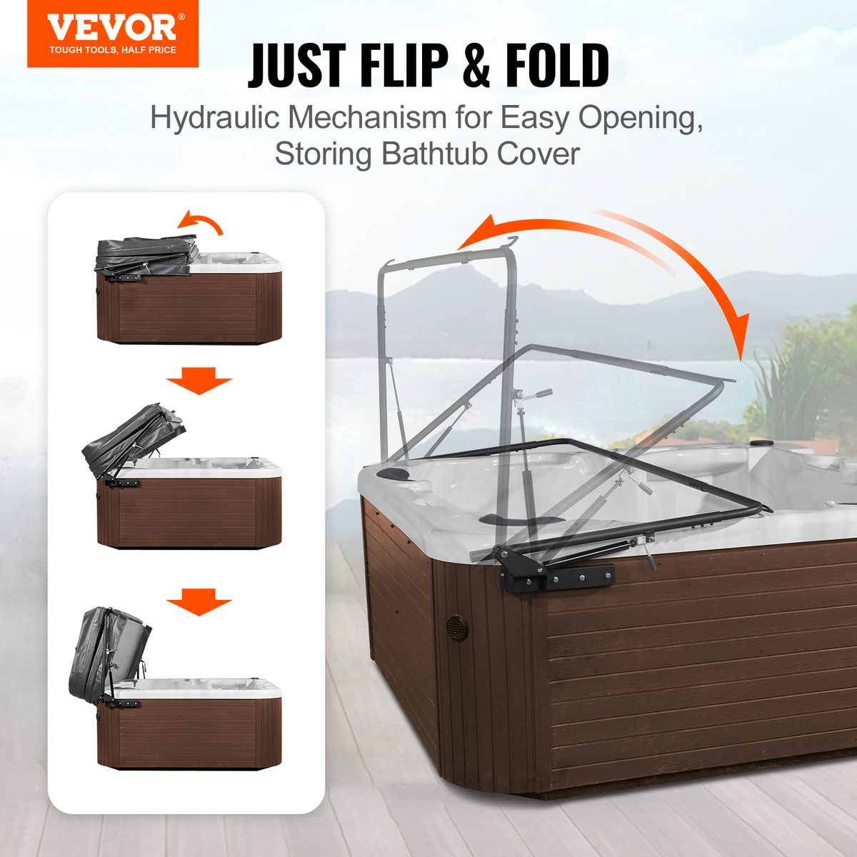 Easy to Open Hot Tub Cover: Moving your hot tub cover is too much work! This lift with hydraulics allows you to open, store and close your hot tub cover with less effort, all you have to do is flip and fold! It doesn't take up space around your hot tub, making it an excellent choice for homes and spas.