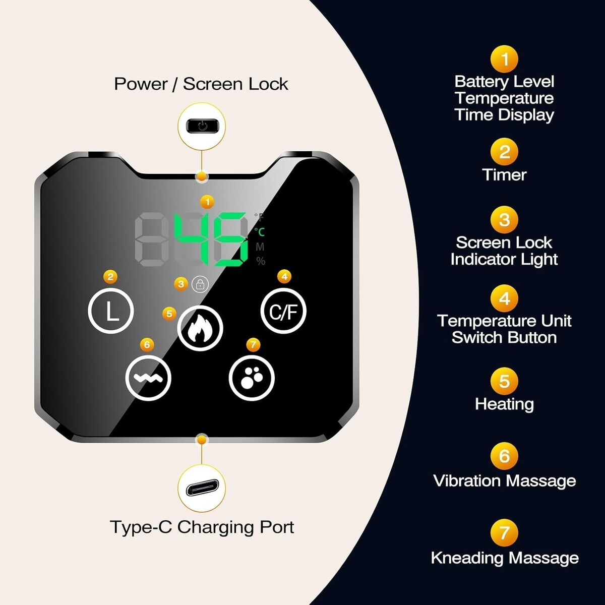 Customizable Comfort Features 4 heating levels (104F to 131F), 3 vibration massage modes for a personalized wellness experience. Easily switch between modes to customize
