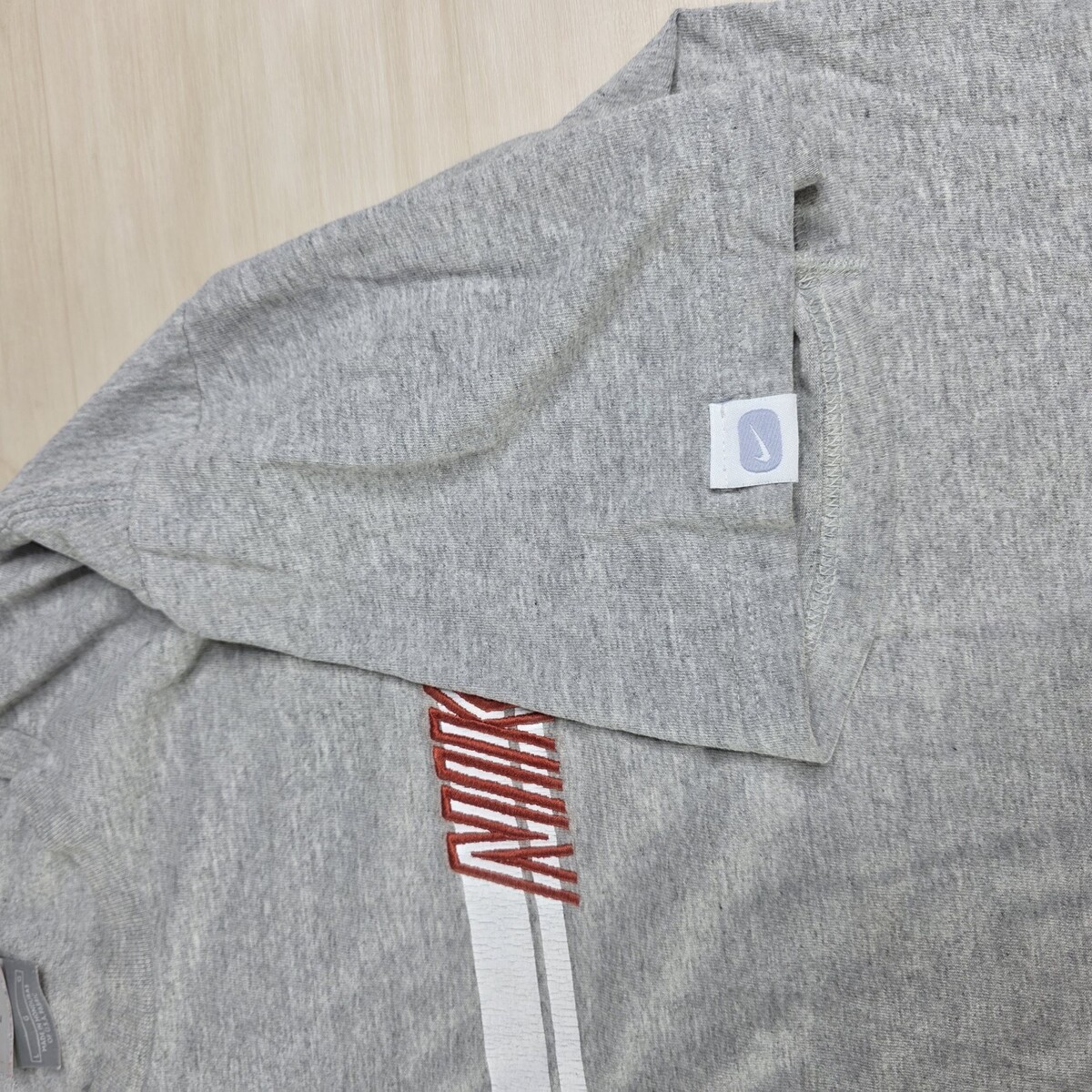 Features a gray heather color with Nike embroidered in red over layered white graphic lines across the chest.