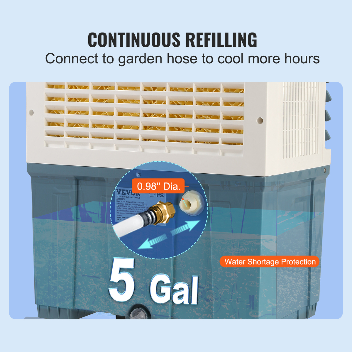 Manual and Continuous Fill: This portable air cooler features a water shortage protection function. It has a large 5 gal tank that can be connected to a garden hose for uninterrupted cooling without the need to constantly refill it with water. Additionally, there is an option to refill water from the top, which is convenient for the elderly and pregnant women as they won't have to bend over.