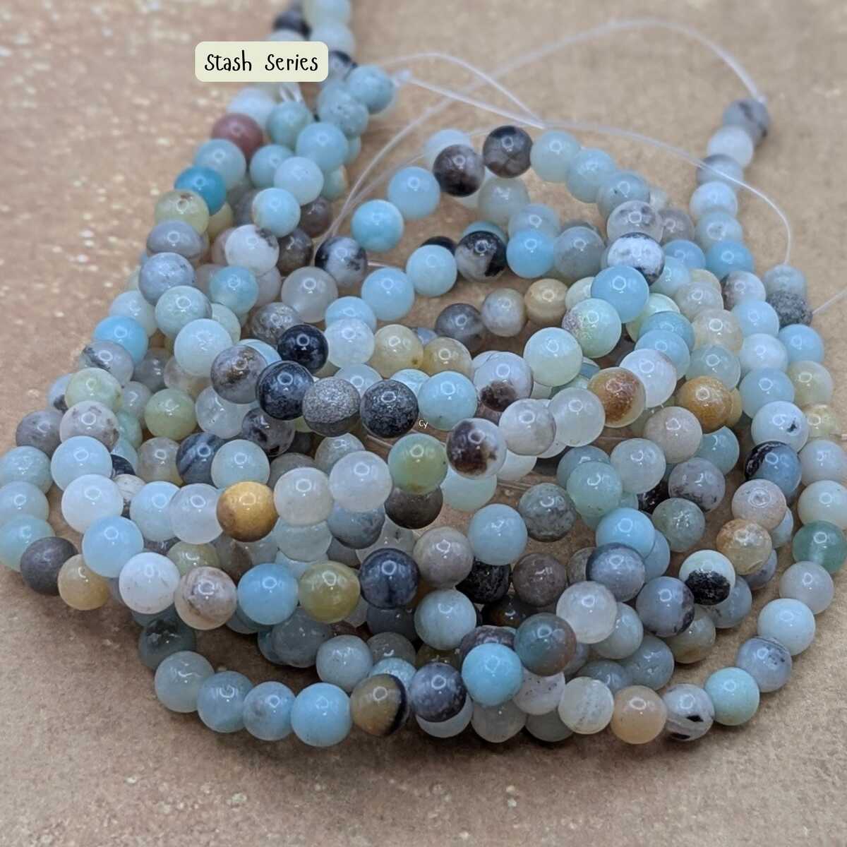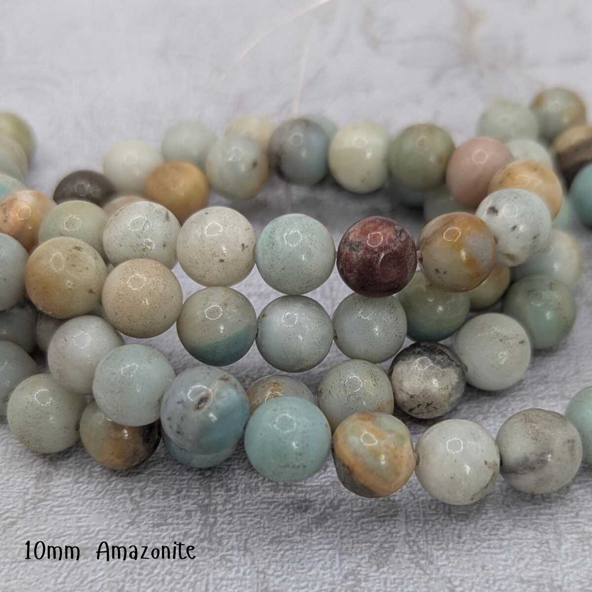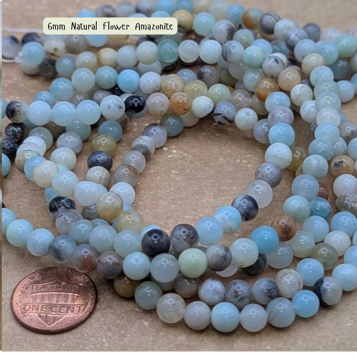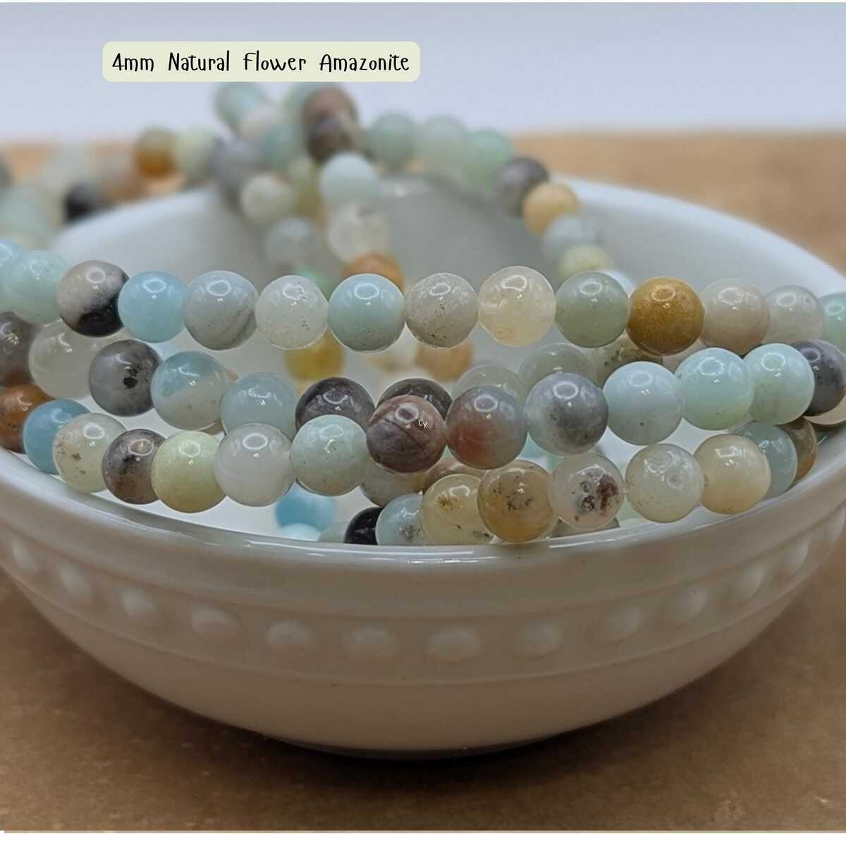 Natural Flower Amazonite round gemstone beads with beautiful soft blue-green tones and natural pattern variation. Available in 4mm or 6mm sizes. Each 15-inch strand contains approximately 85–90 beads (4mm) or fewer larger beads for 6mm and 10mm. Perfect for bracelets, necklaces, malas, and everyday jewelry designs.