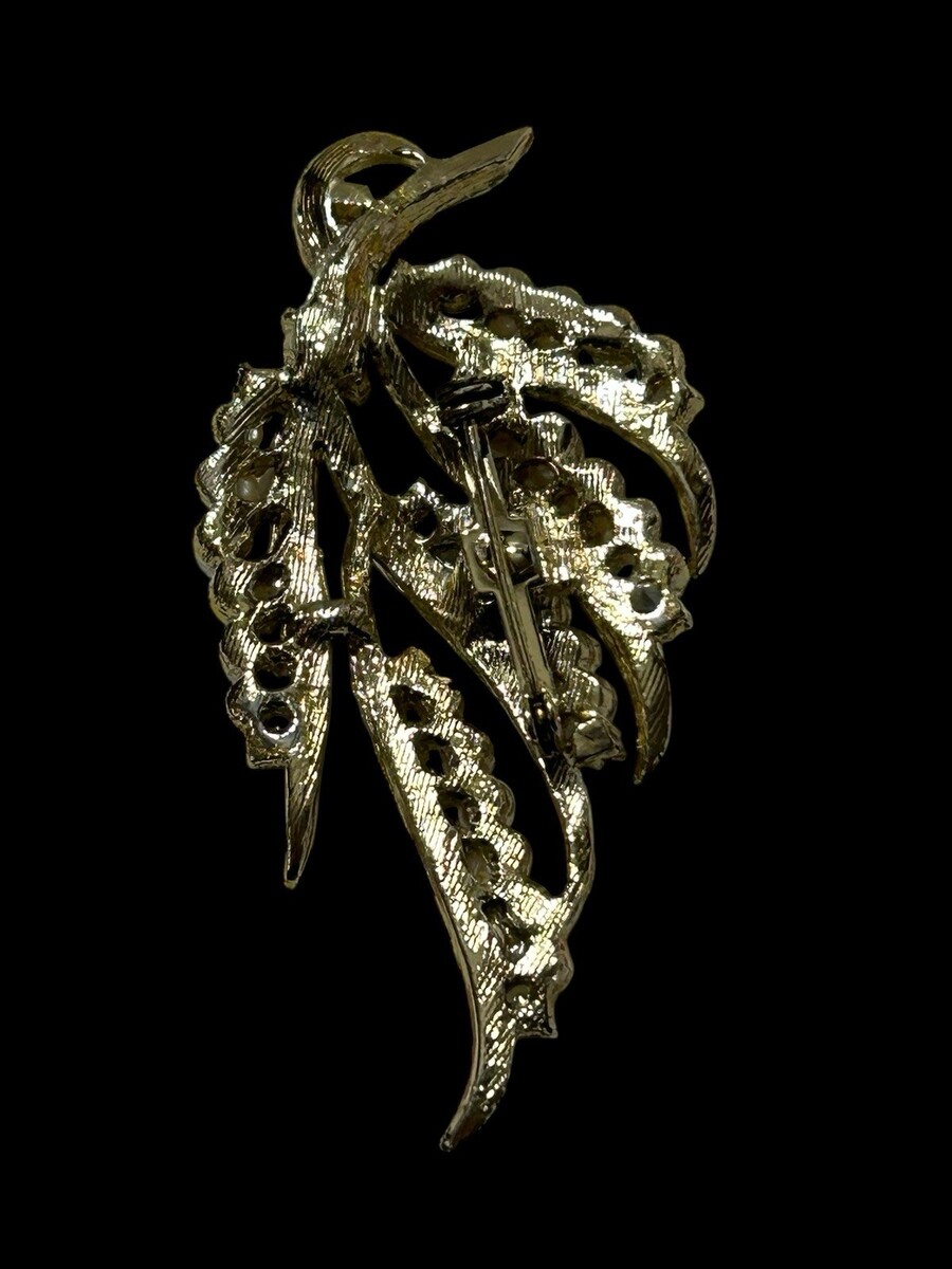 Vintage Floral Leaf Brooch Pin Faux Pearls Rhinestones Gold Tone 3"