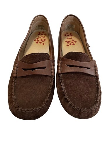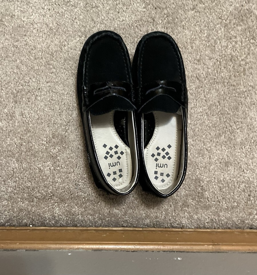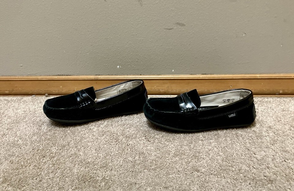 These Moire shoes are classic style black loafers by Umi for little girls. Uppers are real suede leather with patent leather trim and accents. The shoes are comfortable but stylish enough to wear with both casual and dressy attire!