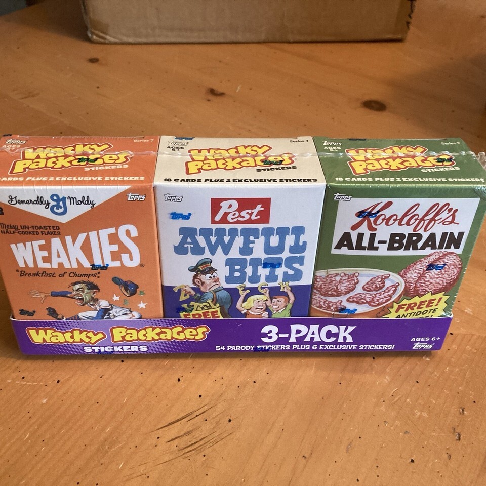 This is 3 mini cereal boxes from the 2010 Topps Wacky Packages Mini Cereal Box Series 7. The box features a parody of the franchise Weakies, Awful Bits, All-Brain. Brand New Sealed! 60 Total Stickers! It is a non-sport trading card and was manufactured by Topps in 2010.