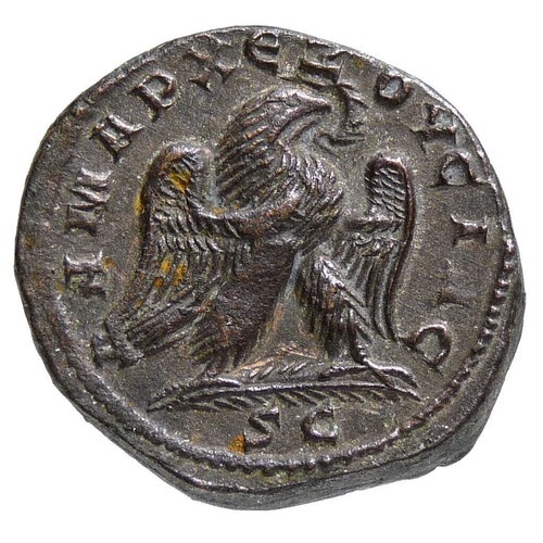 Senatus Consultum (Decree of the Senate). Eagle standing right on palm frond, with wings spread, holding wreath in beak; SC in exergue.