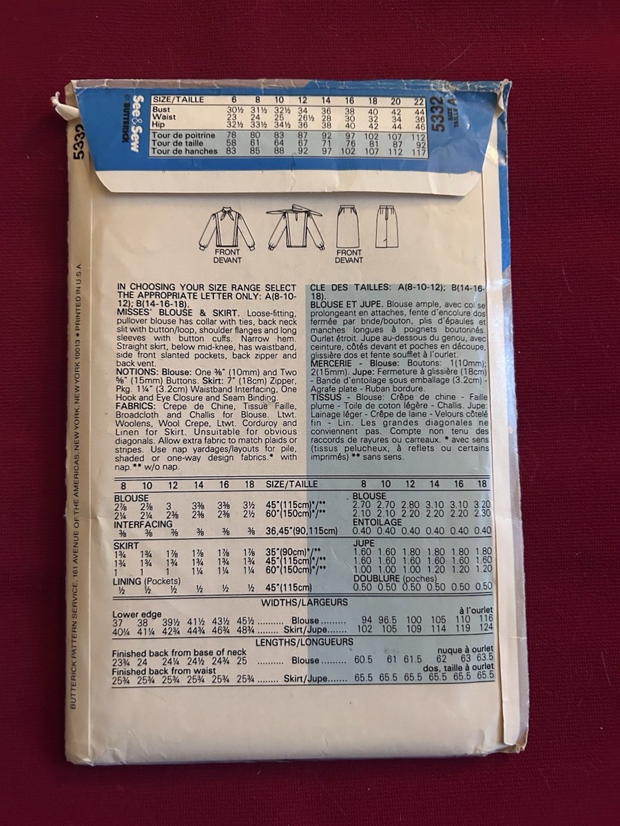 The Vtg Butterick See Conceal Pattern 5332 is a vintage sewing pattern from the 1980s, featuring a blouse and skirt in sizes 8, 10, and 12 for adult and teen female wearers. This uncut pattern is perfect for those interested in retro fashion or looking to create their own unique outfits. The Butterick brand is known for its quality patterns, making this a desirable choice for sewing enthusiasts. With its feminine designs and compatible sizes, this vintage pattern offers a fun and nostalgic project for those who enjoy sewing and fashion.