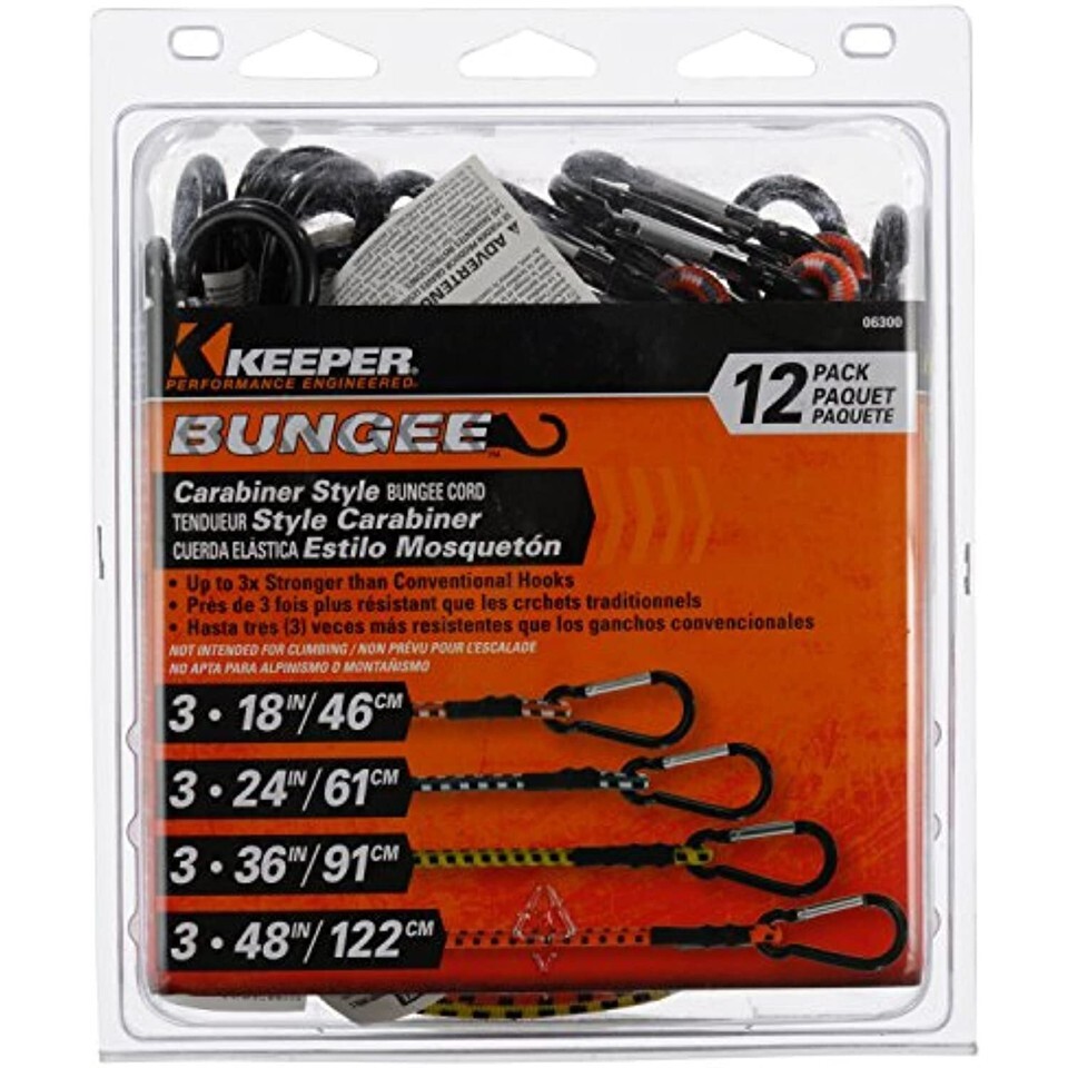 Weather Resistant: Keeper Carabiner Bungee Cords are designed to withstand UV rays and weather damage. Each multi-pack contains (3) 18 in., (3) 24 in., (3) 36 in., and (3) 48 in. bungee cords.