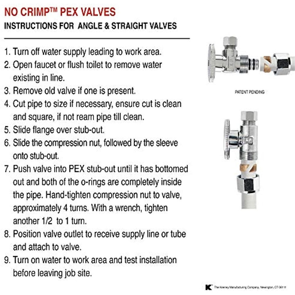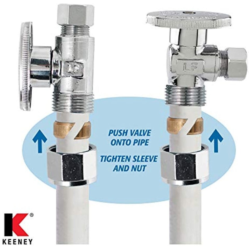 No crimp PEX products from Keeney feature a quick and easy installation that allows you to get the job done confidently. As the nut is tightened onto the valve, the sleeve is compressed around the pipe, internal barb, and double o-ring seals that produces a leak free connection. Other PEX connections require large specialized tools and training in order to successfully complete, no crimp connections can be completed with simple hand tools making install identical to common compression connections for other pipe materials. These valves come with the same Keeney quarter turn ball valve technology that has become known and trusted in the industry for quality and durability. Patent pending. Available in in 1/2 inch comp PEX x 3/8 inch O.D. QUARTER turn no crimp PEX angle valve or straight valve and 1/2 inch comp PEX x 3/8 inch O.D. QUARTER turn no crimp PEX straight valve or angle valve styles.