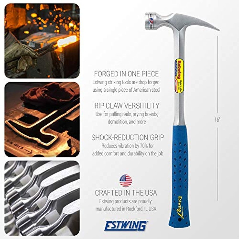 Product Description Estwing's Solid Steel Framing Hammer's feature a longer handle and larger face resulting in more striking power and increase leverage for pulling and prying nails or boards. The head and handle are forged in one piece for maximum durability and hand polished to a beautiful finish. This hammer features our patented Shock Reduction Grip the most comfortable, durable grip on the market. The Shock Reduction Grip reduces impact vibration by over 70%. It is molded and bonded directly to the tools steel core, meaning it will never slip, even under the harshest conditions. Estwing striking tools are proudly made in Rockford, IL. From the Manufacturer This milled-face framing hammer crafted by Estwing offers a forged 1-piece head and handle of tool steel, fully polished and a blue nylon-vinyl, deep-cushion grip that's molded on and absorbs all shock. Since 1923, the Estwing family and its employees have taken pride in designing and manufacturing the world's most durable, comfortable and attractive striking and struck tools. All claw hammers, axes, specialty tools and pry bars are manufactured to the highest possible standards and offer a true value to both tradesmen and craftsmen alike.
