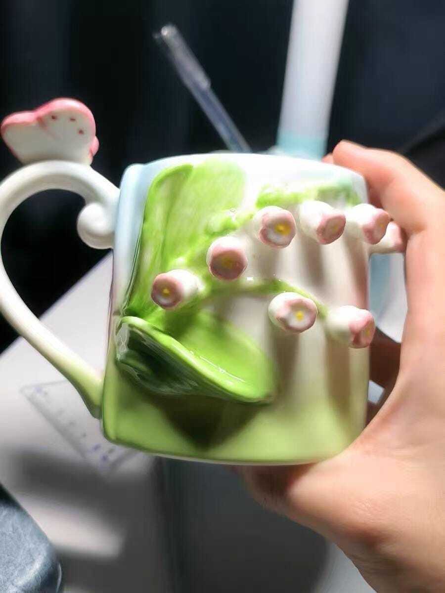 This is a meticulously crafted handmade ceramic mug featuring lily of the valley motifs. The 3D relief gives the flowers a lifelike appearance, complemented by a butterfly-shaped handle for a touch of whimsy. With a capacity of 350ml, it's perfect for your daily coffee, tea, or milk. Its gradient color design adds a unique charm, making it an ideal and thoughtful gift for birthdays, anniversaries, or as a special present for a friend.
