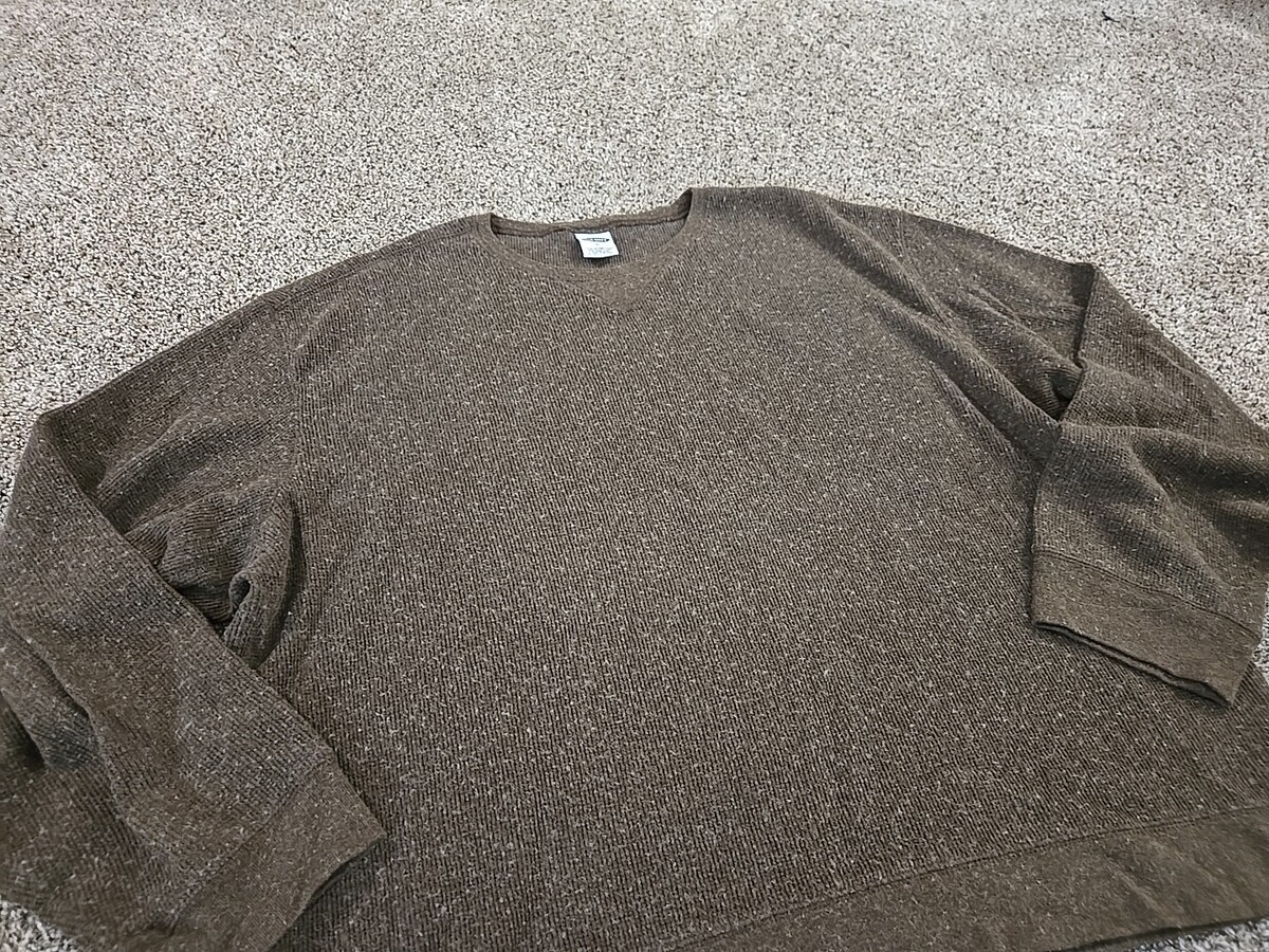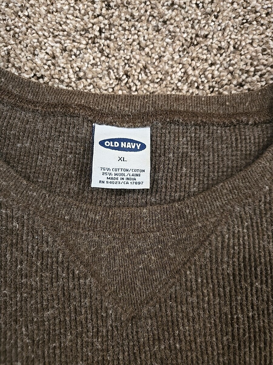 The Old Navy Vtg Y2K 2001 Wool Blend Thermal Shirt is a vintage men's t-shirt in size XL, featuring a relaxed fit and a brown color. Made from a wool and cotton blend, this shirt is perfect for the winter, fall, and spring seasons. With long sleeves, a crew neckline, and machine washable care instructions, this shirt combines comfort and style with its grunge and outdoor theme, ideal for gorpcore fashion enthusiasts. Made by Old Navy, this thermal shirt is a unique addition to any wardrobe looking for a rugged, retro look.