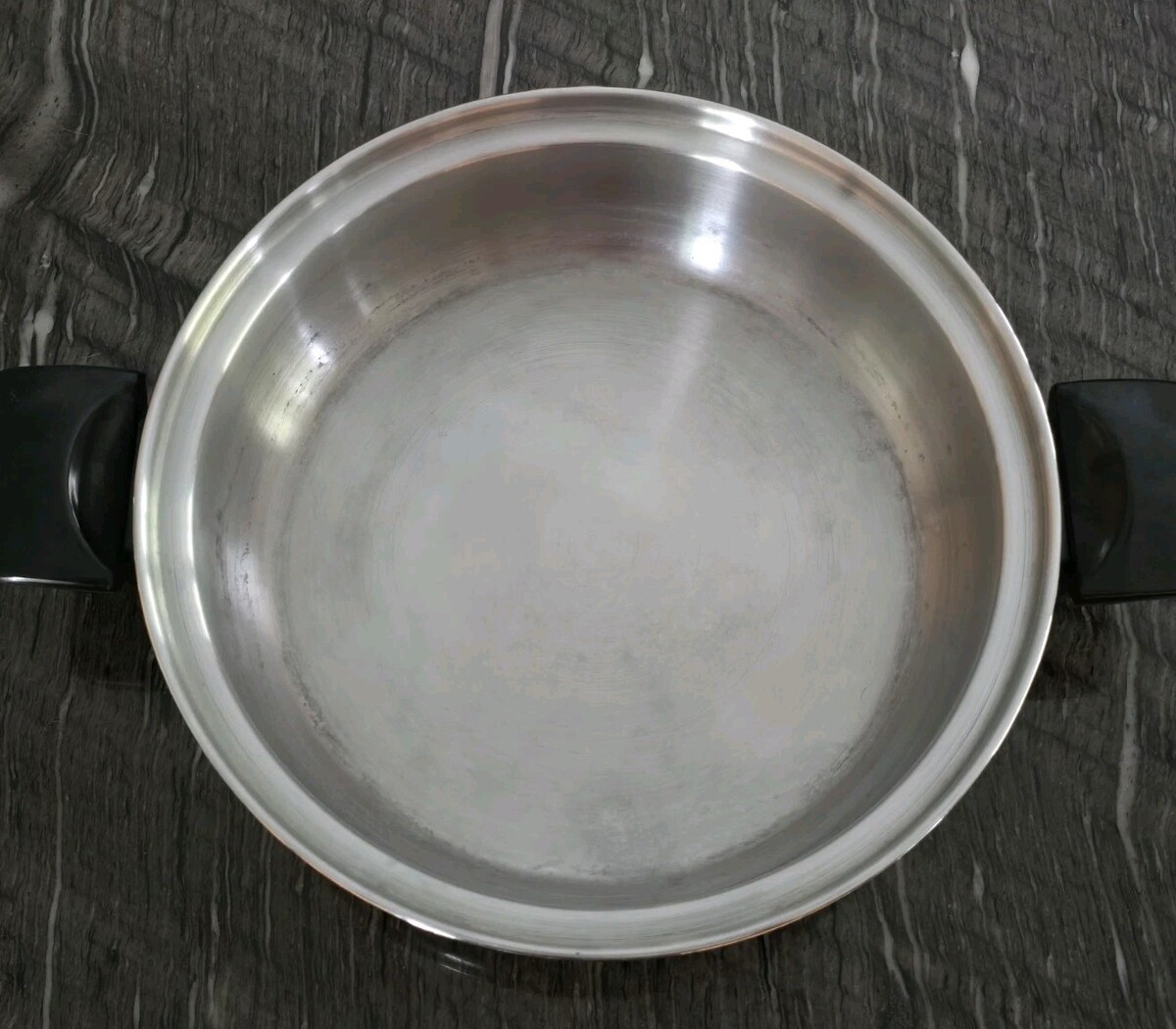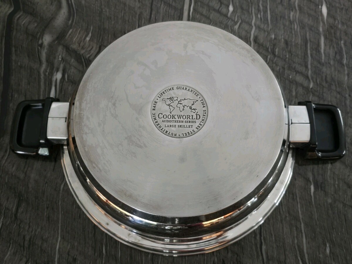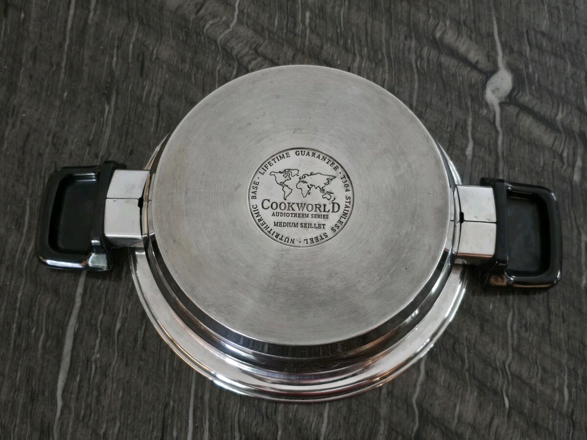 Please see all photos. Some stains. The Cookworld Audiotherm Series T304 Stainless 6 Pc. Set includes 2 skillets and 2 qt. pot lids, perfect for any kitchen. Made of high-quality stainless steel, these saucepans are compatible with induction, electric, and gas stoves. featuring a sleek silver color and a durable stainless steel surface coating. With practical features like double handles, lids, and dishwasher safe convenience, this set is ideal for any home cook looking for reliable and versatile cookware.