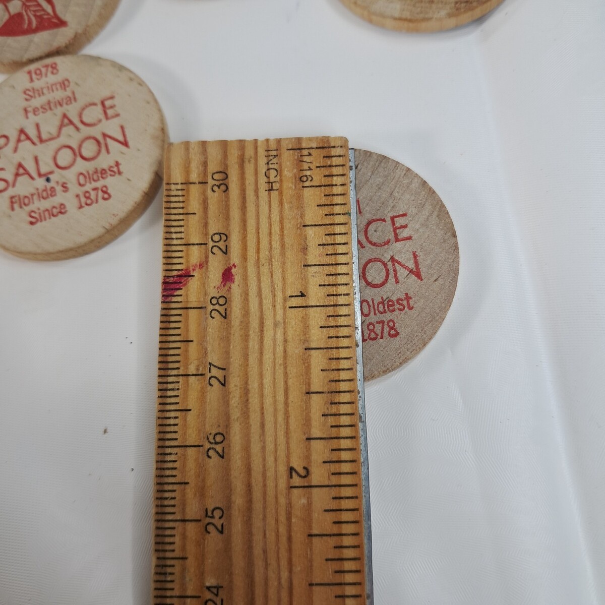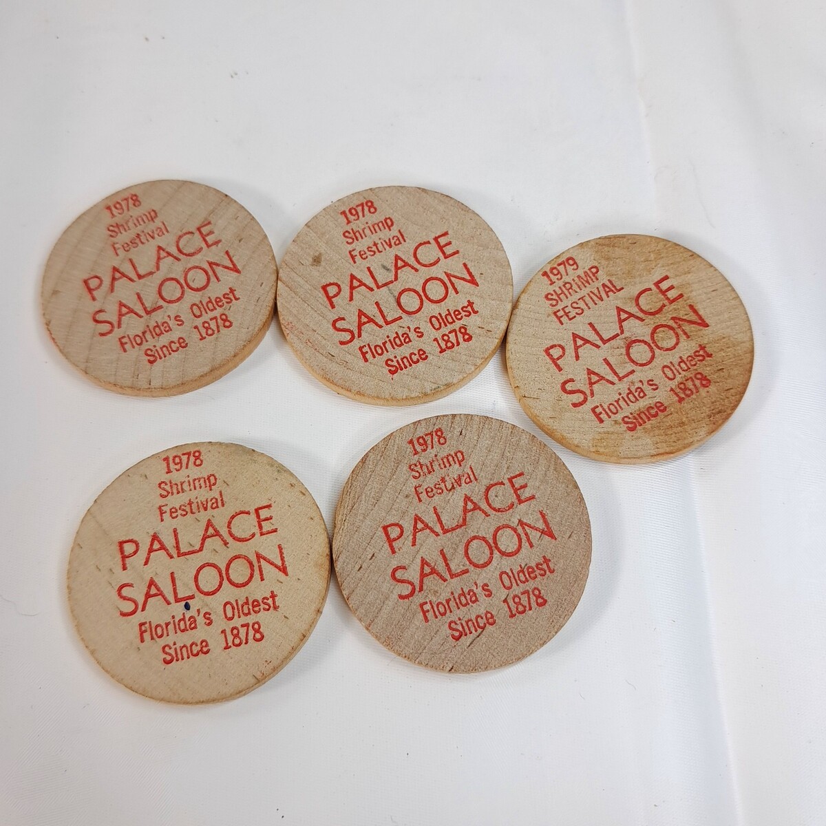 Wooden Nickel set 5 Shrimp Festival Palace Saloon Florida 1978 1979 wood Vintage