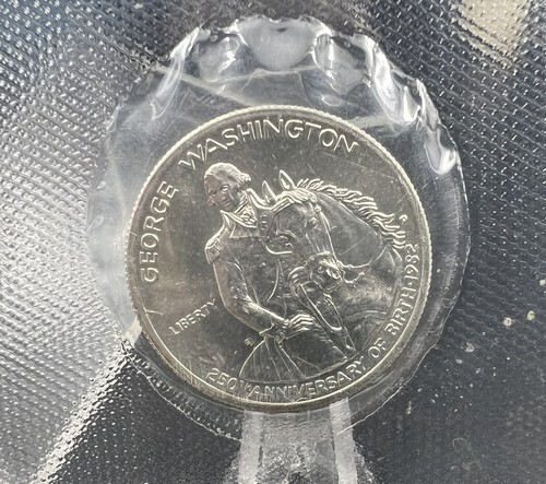 1982 George Washington 250th Anniversary uncirculated silver half dollar KM 205 in original presentation box with insert. First modern US commemorative coin and struck in 90 percent silver with 0.36169 ounces of silver content. Strong collectible value for silver buyers and US Mint coin collectors. Every order ships safely and securely from Joshua?s Cards Coins Collectibles.