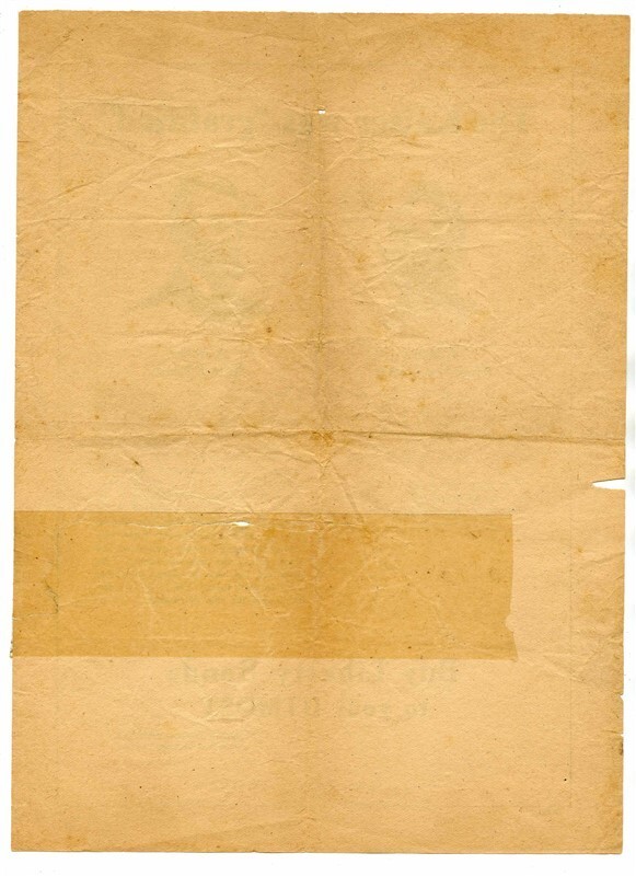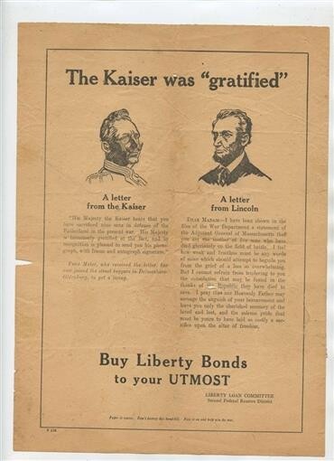 A World War One Handbill. The Kaiser was Gratified A Letter From the Kaiser and A Letter From Lincoln . Buy Liberty Bonds to Your Utmost. in Fair condition , had been folded, has edge chip and has tape repaired tear. Measures about 8" x 10 7/8" and the back is blank.