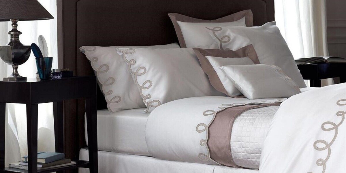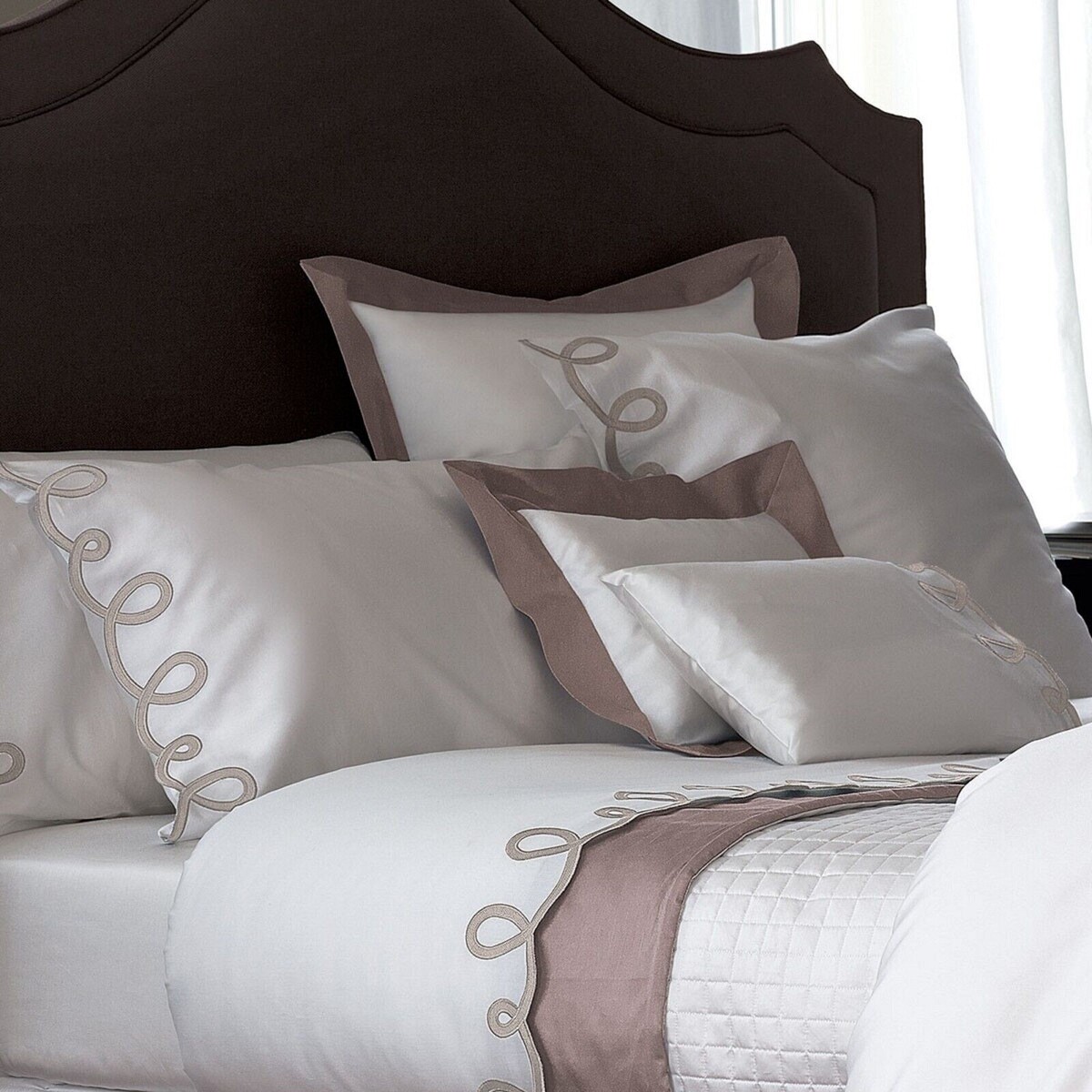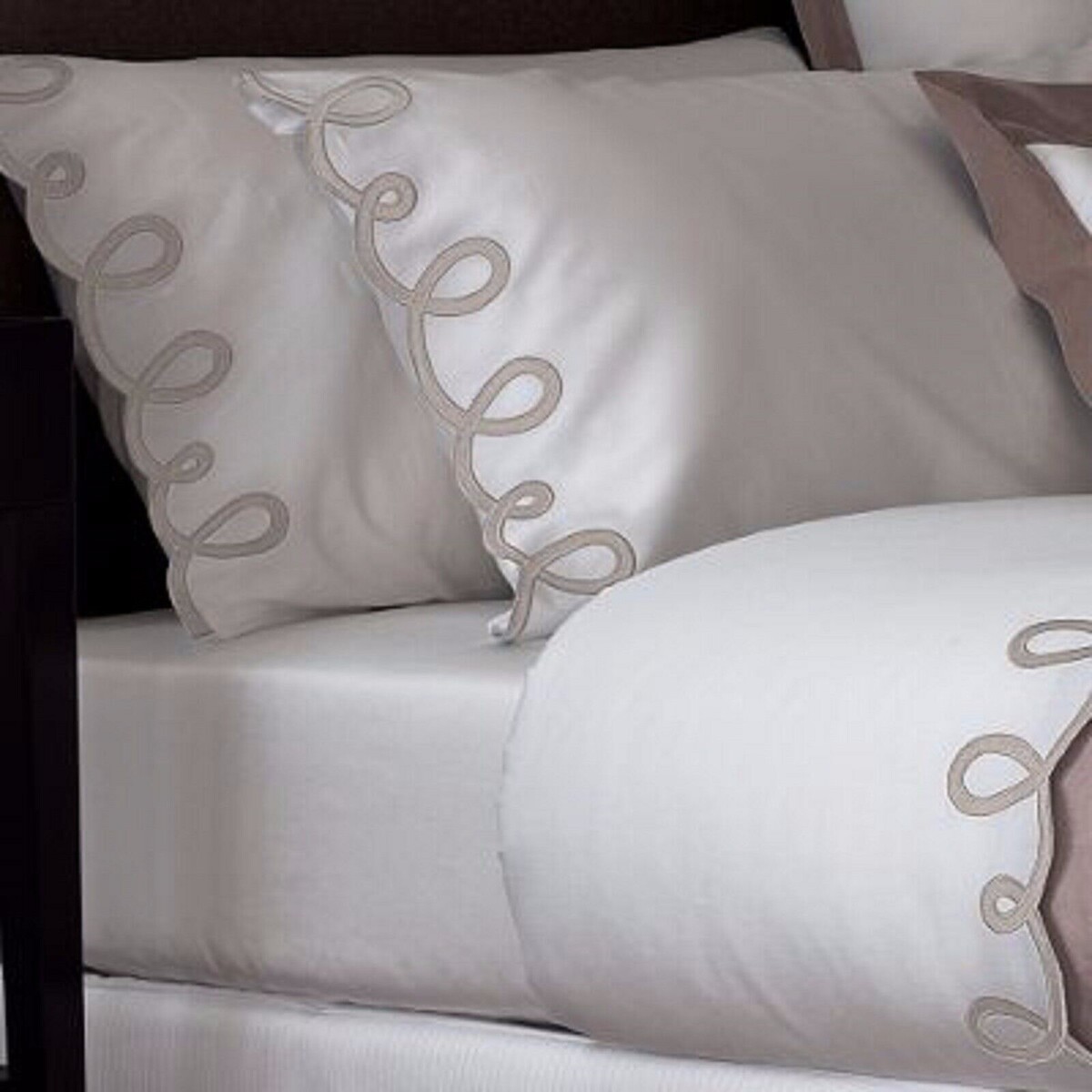 The Italics Cafe Creme bedding features the unique scrolling embroidery in Taupe Cafe Creme, bordering luxurious White sateen. Like music scales, repeating and uninterrupted curves illustrate two aspects of the art of writing: infinity and mastery of gesture.