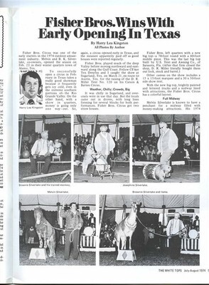 The White Tops is the official magazine of the Circus Fans Association of America, better known as the CFA. White Tops began as a newsletter in May, 1927 This is the 48 page, July August 1974 issue with CFA President J Allen Duffield on the cover. Many feature articles on Circus History.. Many Illustrations.
