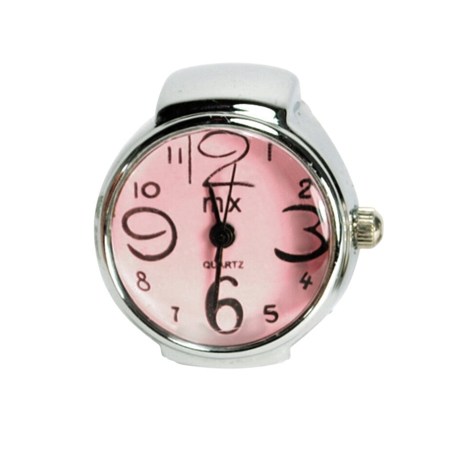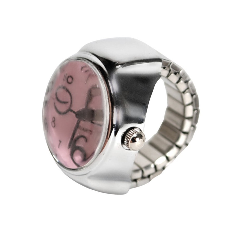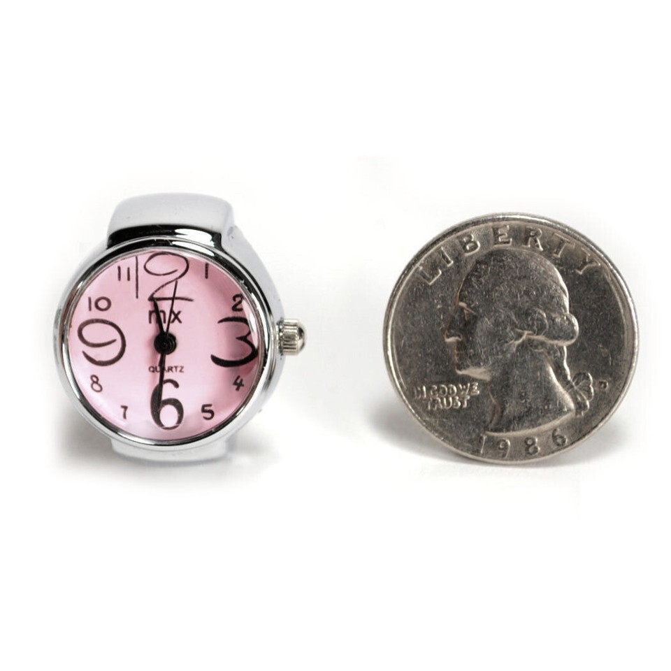 WATCH RING Finger Stretch Band Chrome Time Piece Jewelry Round Pink Face Gift
