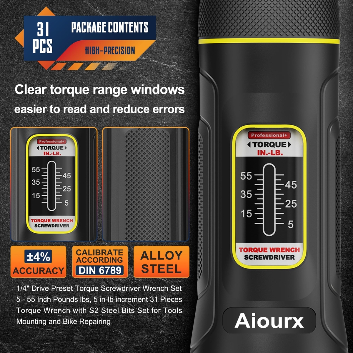 The scale on this torque wrench screwdriver is clear, easy to read, and intuitive, allowing users to easily set and adjust the required torque value. At the same time, each of our bits features high-visibility color coding for quick and easy size identification