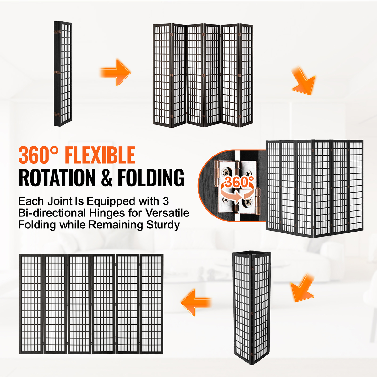 360 Rotating and Folding: Each room divider panel connects with three flexible bidirectional hinges, allowing you to rotate it 360 and fold it in any direction. This design ensures stability while you use it. When you're not using this room divider, simply fold it up and tuck it away in a corner - no clutter, just convenience. Set it up in a zigzag for added support and to avoid tipping.