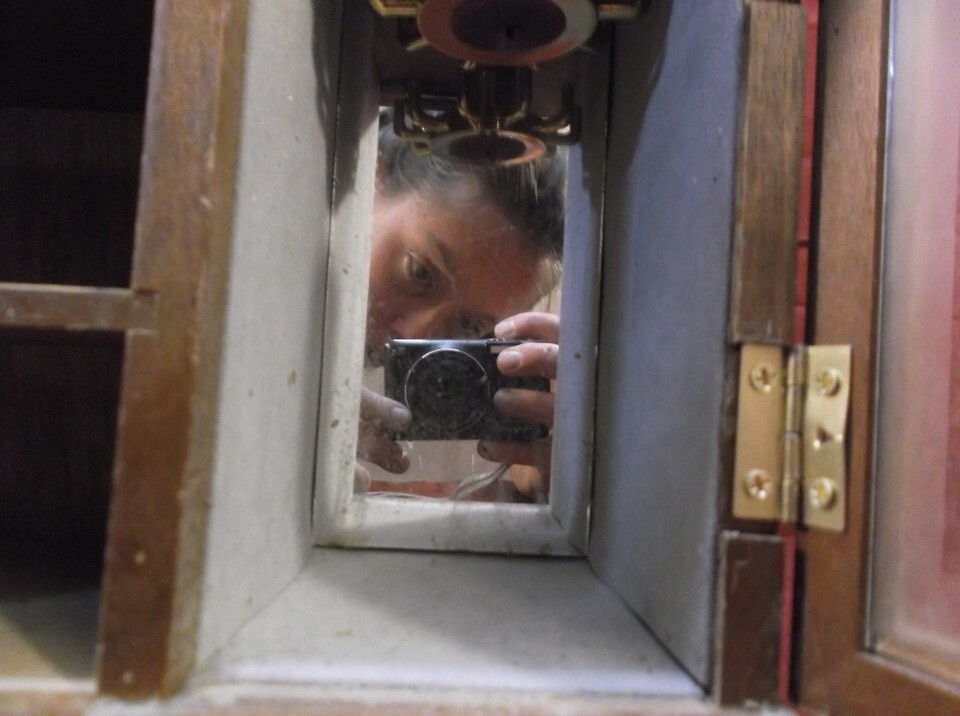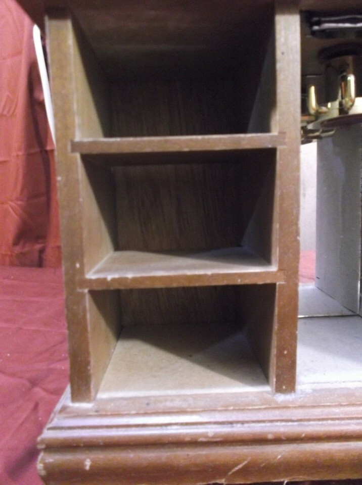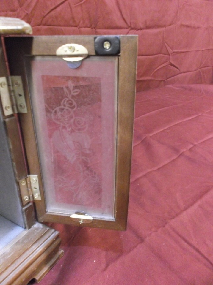 One side has a little glass door that opens up to multiple necklace, bracelet, or chain hangers. The glass door has a small picture made from frosted glass. It is a Heart with a Flower around it. This section is also large enough for certain pieces of jewelry to sit on the bottom underneath the 'hangers.' This compartment has a small mirror on the back side of it (see pictures).