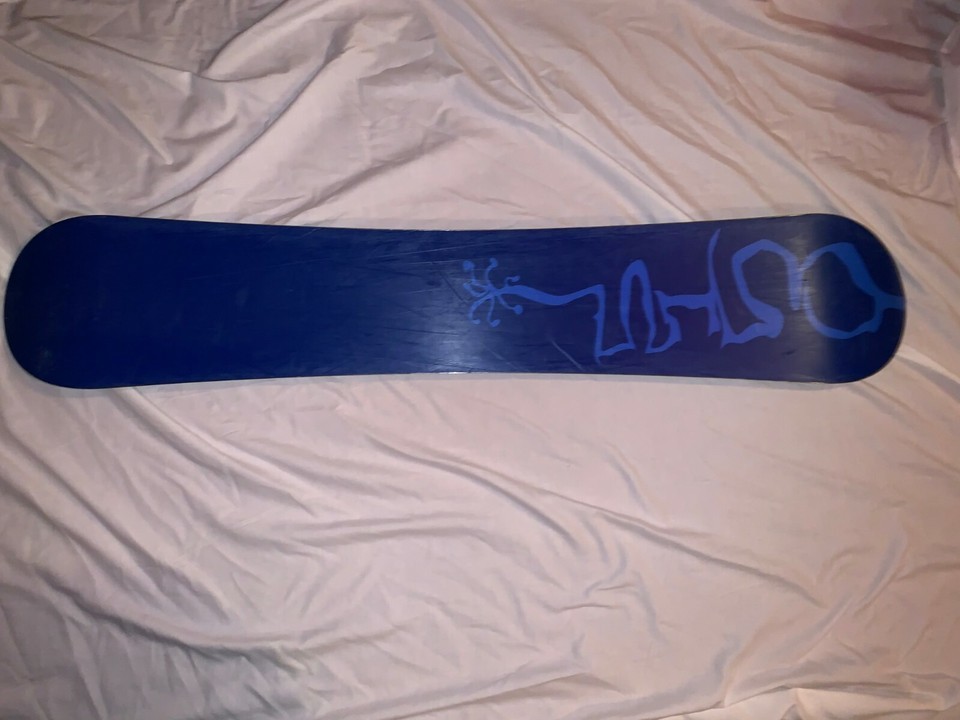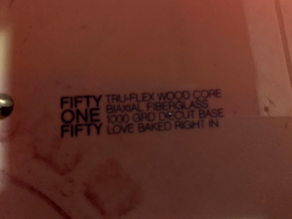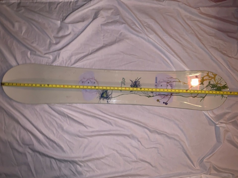 BACK HAS SCRATCHES AND COULD USE RESURFACE, THERE IS DEEP SCRATCH THAT THIS ON THE TOP END OF THE BOARD, THERE ORIGINAL COLOR WAS A MORE PALE PURPLE WHITE COLOR BUT HAS BEEN SUNFADED TO A CREME BUT THE ORIGINAL COLOR CAN BE SEEN WHERE THE BINDINGS SIT, BOARD NEEDS SOME LOVE AND TLC BUT WILL BE AN AMAZING BOARD FOR THIS SEASON.