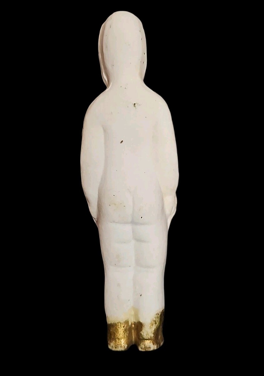Condition is very good antique condition overall. Light surface speckling and age spots from over a century of life. Wear to the gold paint on the feet, consistent with age. Facial features remain visible with some soft fading. No cracks, breaks, or repairs observed.